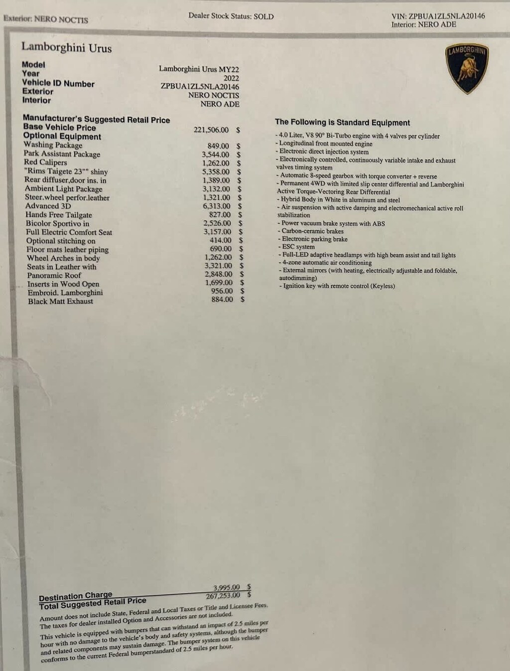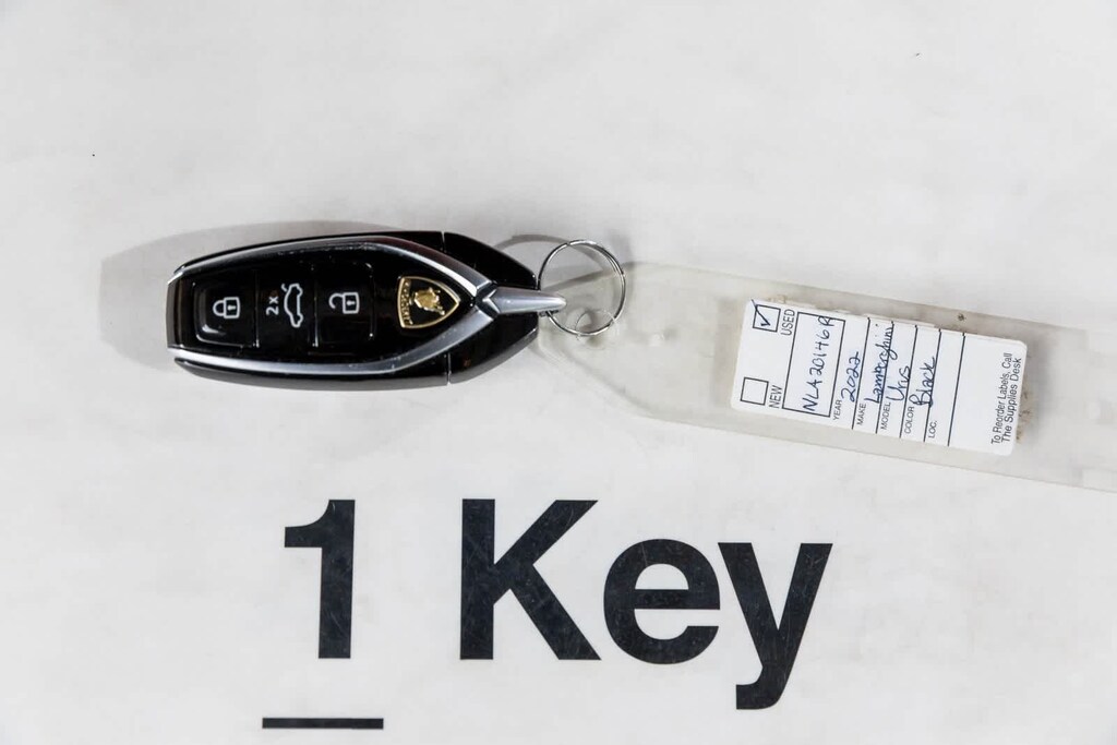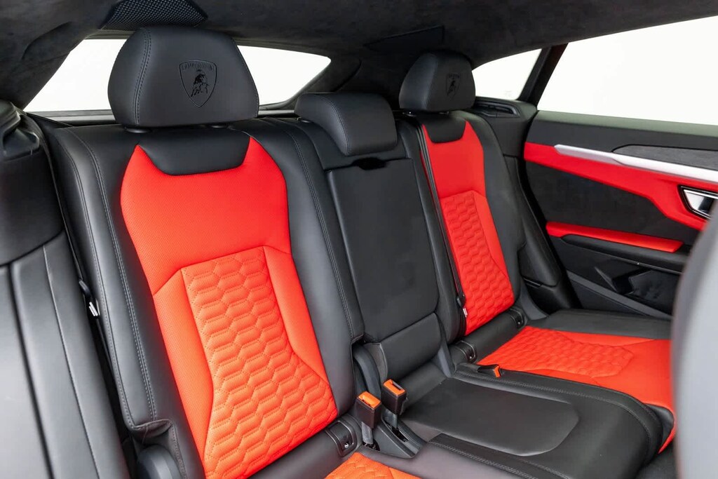 ABS brakes, Active Cruise Control, Advanced 3D Bang & Olufsen Sound System, Alloy wheels, Bicolor Sportivo Leather Seat Upholstery, Black Matt Exhaust Tailpipes, Compass, Door Inserts in High Gloss Black, DVD-Audio, Electronic Stability Control, Embroidered Lamborghini Shield on Headrest, Emergency communication system, Floormats w/Leather Piping & Double Stitching, Front dual zone A/C, Fully Electric Ventilated/Heated Front Comfort Seats, Hands Free Tailgate, Heated door mirrors, Heated Front Bucket Seats, Heated front seats, Heated Perforated Leather Steering Wheel, High Gloss Black Rear Diffuser & Door Inserts, Illuminated entry, Inserts in Wood Open Pore w/Aluminum Inlay, Interior Stitching, Low tire pressure warning, Navigation System, Panoramic Roof, Power Liftgate, Rear Diffuser in High Gloss Black, Rear dual zone A/C, Red Calipers, Remote keyless entry, Traction control, Washing Package, Wheel Arches in Body Color, Wheels: 23 x 10J Fr & 23 x 11.5J Rr Taigete Shiny Blk. Odometer is 2045 miles below market average!