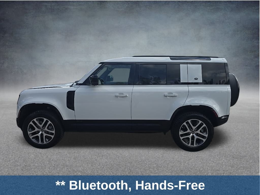 This Defender 110 is well equipped with Defender 110 X-Dynamic HSE, 4D Sport Utility, 3.0L I6, 8-Speed Automatic, 4WD, White, Ebony Leather, 11 Speakers, 14-Way Heated & Cooled Electric Memory Seats, 3.55 Axle Ratio, 4-Wheel Disc Brakes, ABS brakes, Adaptive suspension, Air Conditioning, Alloy wheels, AM/FM radio: SiriusXM, Apple CarPlay & Android Auto, Auto High-beam Headlights, Auto tilt-away steering wheel, Auto-dimming door mirrors, Auto-dimming Rear-View mirror, Automatic temperature control, Brake assist, Bumpers: body-color, Compass, Delay-off headlights, Driver door bin, Driver vanity mirror, Dual front impact airbags, Dual front side impact airbags, Electronic Stability Control, Four wheel independent suspension, Front anti-roll bar, Front Bucket Seats, Front Center Armrest, Front dual zone A/C, Front fog lights, Front reading lights, Fully automatic headlights, Garage door transmitter: HomeLink, Heated door mirrors, Heated front seats, Illuminated entry, Leather Shift Knob, Leather steering wheel, Low tire pressure warning, Memory seat, Occupant sensing airbag, Outside temperature display, Overhead airbag, Overhead console, Panic alarm, Passenger door bin, Passenger vanity mirror, Power door mirrors, Power driver seat, Power moonroof, Pow