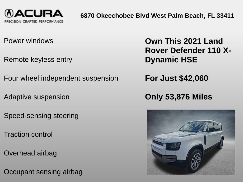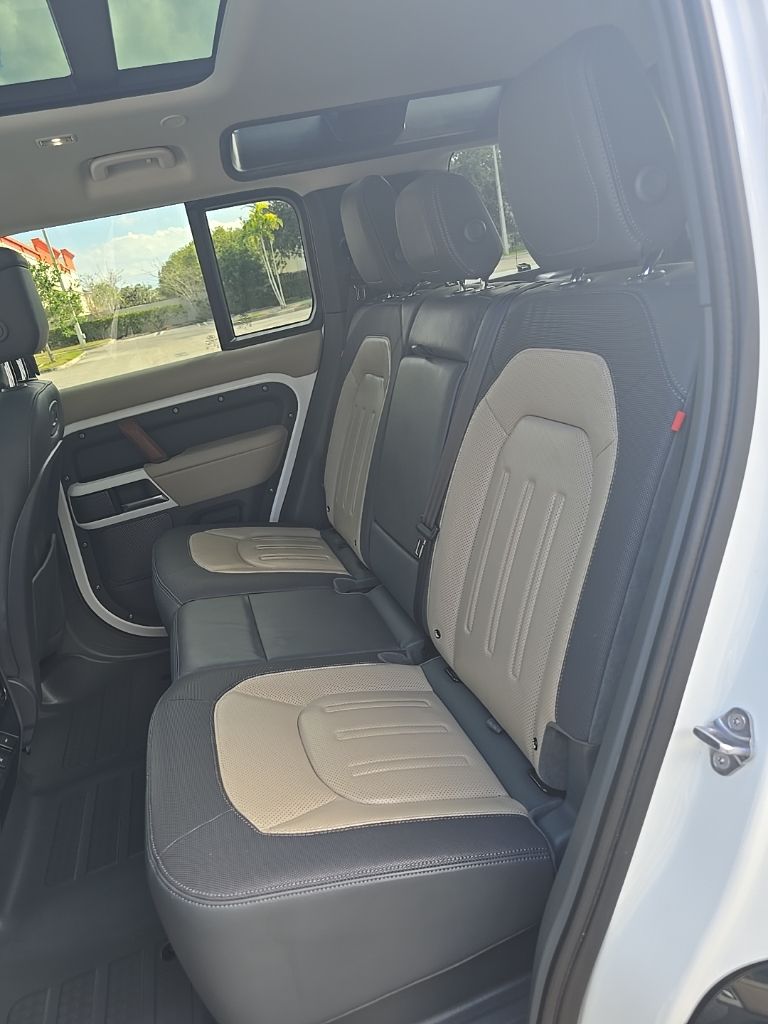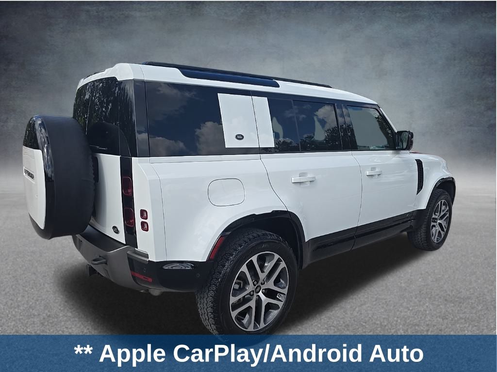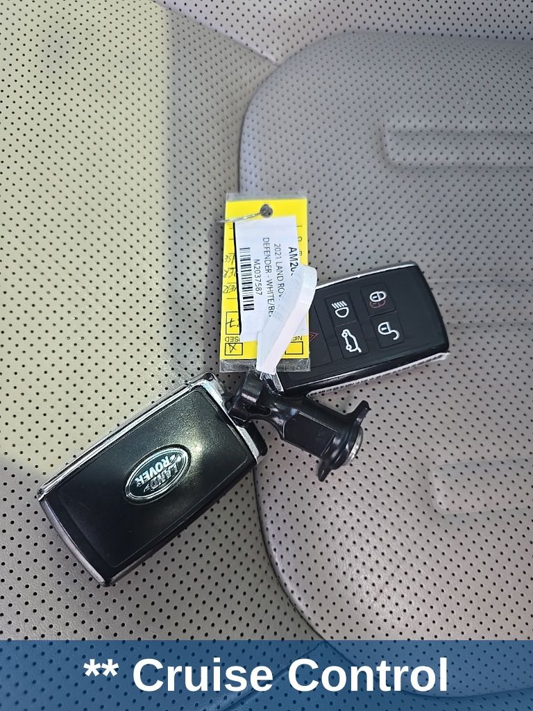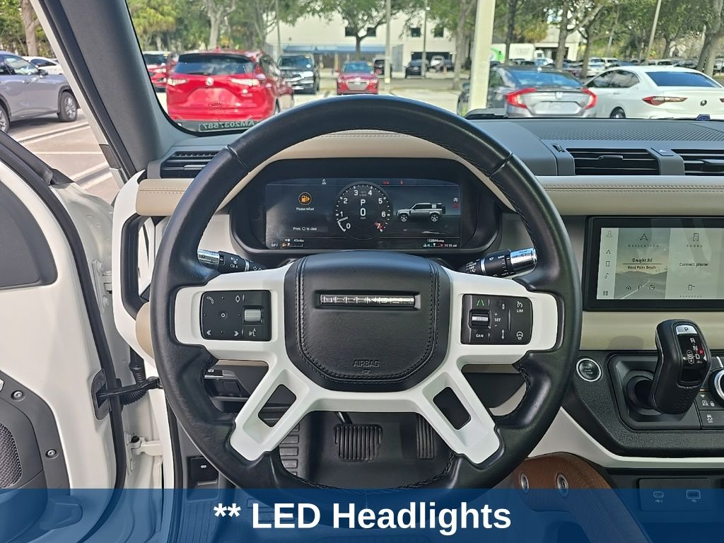 ** Adaptive cruise control, ** Alloy Wheels / Premium Wheels, ** Apple CarPlay/Android Auto, ** Backup Camera, ** Blind Spot Monitor, ** Bluetooth, Hands-Free, ** Brake Assist, ** Cooled Seats, ** Cruise Control, ** Heated Seats, ** Heated Steering Wheel, ** Keyless Entry, ** Lane Departure Warning, ** Leather Seats, ** LED Headlights, ** Memory Seat, ** Navigation System, ** Premium Sound System / DVD Player, ** Rear Cross Traffic Alert, ** Satellite Radio, ** Security System, ** Stability Control, ** Steering Wheel Controls, ** Sunroof/Moonroof, ** Tow Hitch / Trailer Hitch, ** USB Port, Defender 110 X-Dynamic HSE, 4D Sport Utility, 3.0L I6, 8-Speed Automatic, 4WD, White, Ebony Leather, 11 Speakers, 14-Way Heated & Cooled Electric Memory Seats, 3.55 Axle Ratio, 4-Wheel Disc Brakes, ABS brakes, Adaptive suspension, Air Conditioning, Alloy wheels, AM/FM radio: SiriusXM, Apple CarPlay & Android Auto, Auto High-beam Headlights, Auto tilt-away steering wheel, Auto-dimming door mirrors, Auto-dimming Rear-View mirror, Automatic temperature control, Brake assist, Bumpers: body-color, Compass, Delay-off headlights, Driver door bin, Driver vanity mirror, Dual front impact airbags, Dual front side impact airbags, Electronic Stability Control, Four wheel independent suspension, Front anti-roll bar, Front Bucket Seats, Front Center Armrest, Front dual zone A/C, Front fog lights, Front reading lights, Fully automatic headlights, Garage door transmitter: HomeLink, Heated door mirrors, Heated front seats, Illuminated entry, Leather Shift Knob, Leather steering wheel, Low tire pressure warning, Memory seat, Occupant sensing airbag, Outside temperature display, Overhead airbag, Overhead console, Panic alarm, Passenger door bin, Passenger vanity mirror, Power door mirrors, Power driver seat, Power moonroof, Power passenger seat, Power steering, Power windows, Radio data system, Radio: 400W 11 Speaker Meridian Sound System, Rain sensing wipers, Rear anti-roll bar, Rear fog lights, Rear reading lights, Rear seat center armrest, Rear window defroster, Rear window wiper, Remote keyless entry, Roof rack: rails only, Security system, Speed control, Speed-sensing steering, Speed-Sensitive Wipers, Split folding rear seat, Steering wheel memory, Steering wheel mounted audio controls, Tachometer, Telescoping steering wheel, Tilt steering wheel, Traction control, Trip computer, Variably intermittent wipers, Ventilated front seats, Weather band radio, Wheels: 20" Satin Dark Gray Finish Style 5098, Windsor Leather Seat Trim.