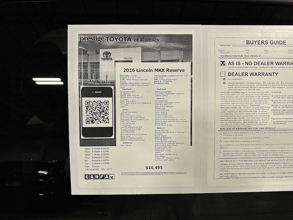 This 2016 Lincoln MKX Reserve will not make it to the weekend!! CALL NOW to reserve your test drive!! (844) 838-7075 Please Visit www.PrestigeToyota.com for further details. Price does not include licensing costs, registration fees, taxes and dealer doc fee of $999 which are to be paid by the consumer.