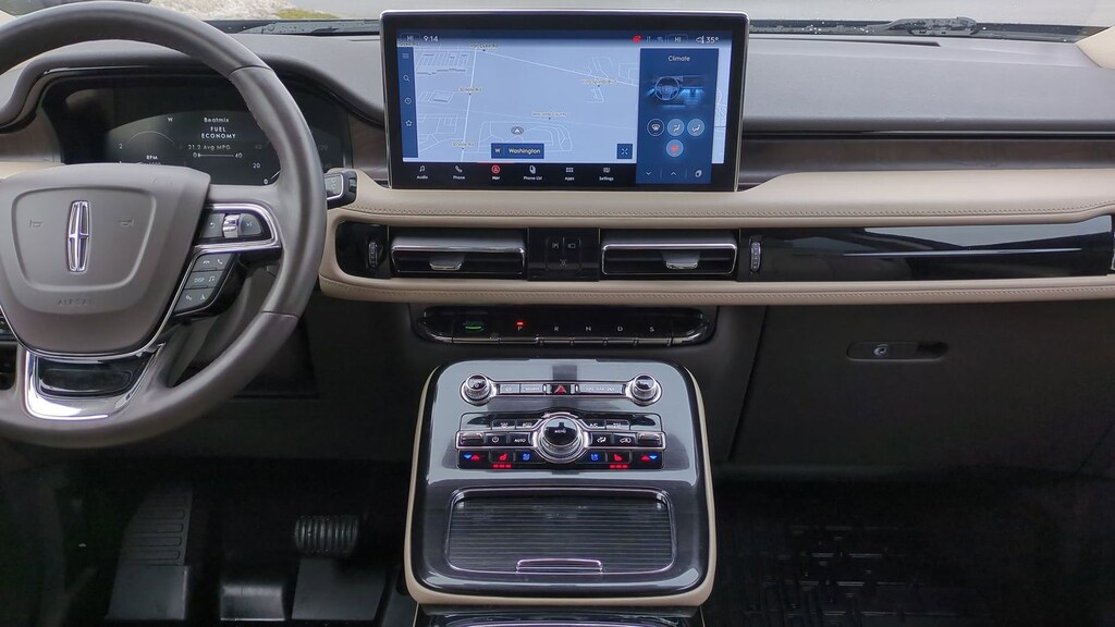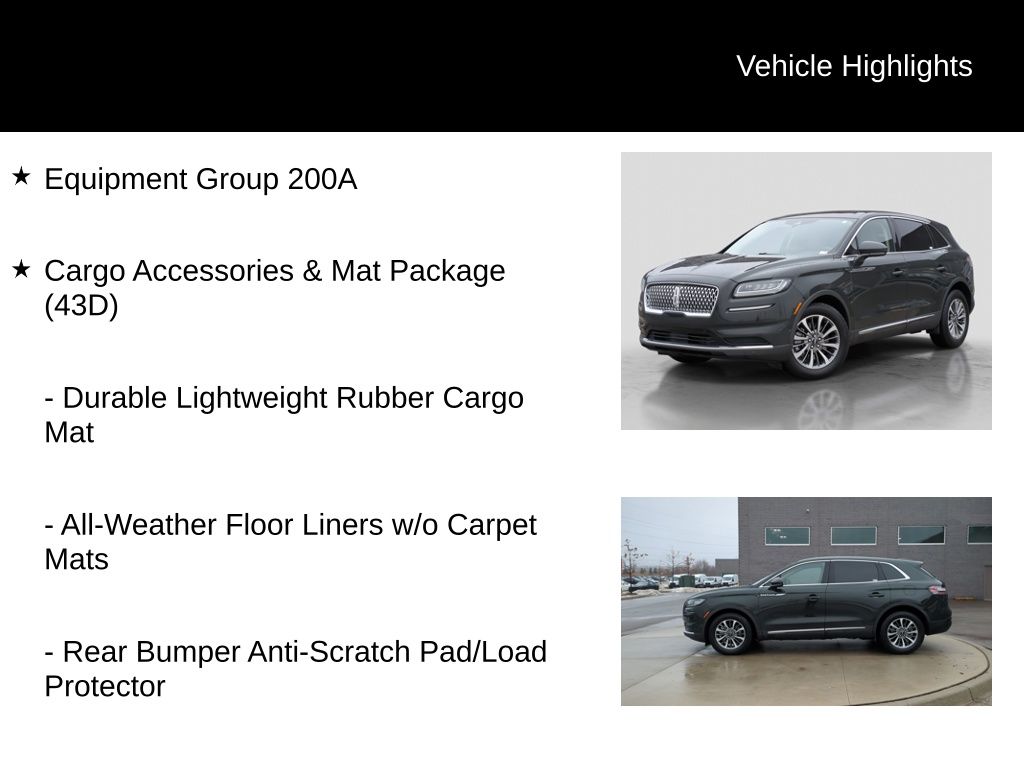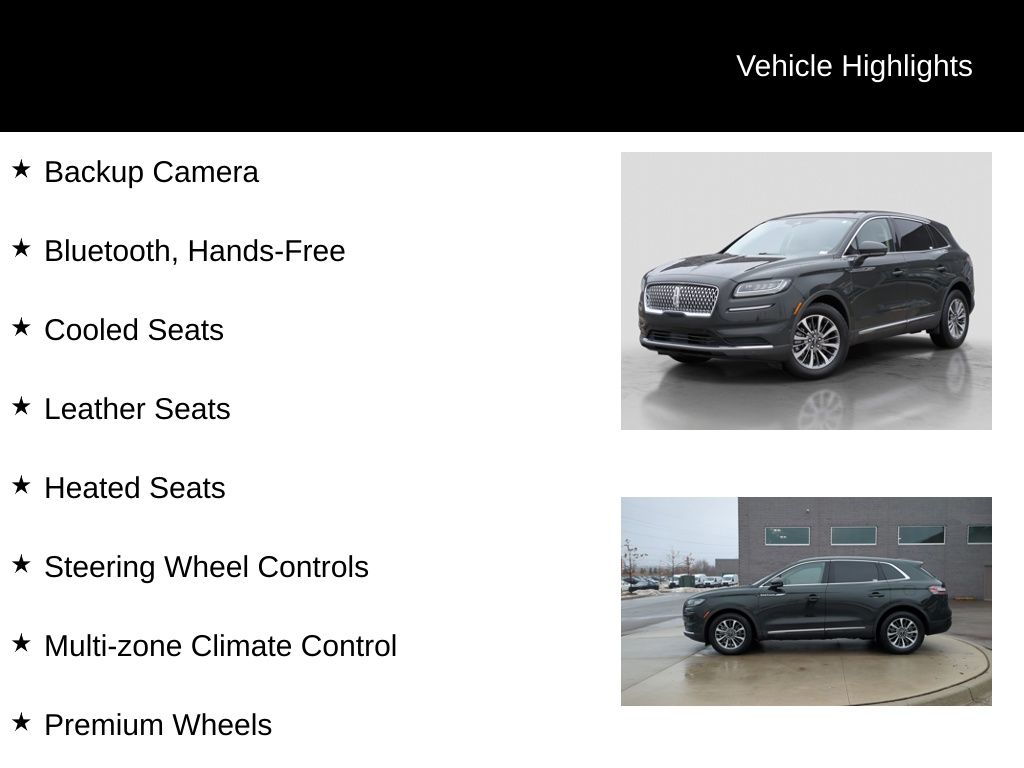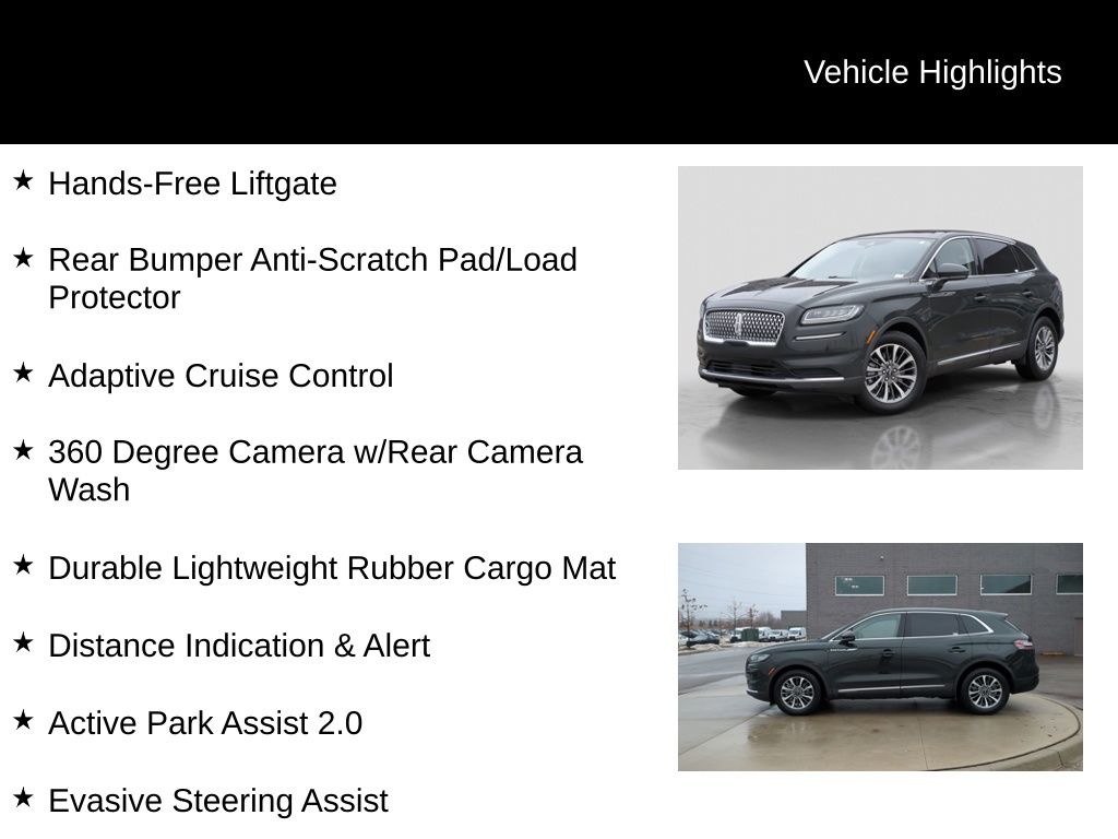 2022 Lincoln Nautilus Reserve Is nicely equipped with Cargo Accessories & Mat Package (43D) (All-Weather Floor Liners w/o Carpet Mats, Durable Lightweight Rubber Cargo Mat, and Rear Bumper Anti-Scratch Pad/Load Protector), Equipment Group 200A, Lincoln Co-Pilot360 1.0 Plus Package (360 Degree Camera w/Rear Camera Wash, Active Park Assist 2.0, Adaptive Cruise Control, Distance Indication & Alert, Evasive Steering Assist, and Forward-Side-Rear Parking Sensors), Luxury Package (Hands-Free Liftgate, Phone As A Key, and Revel Audio System w/13 Speakers), 10 Speakers, 3.80 Axle Ratio, 4-Wheel Disc Brakes, ABS brakes, Air Conditioning, Alexa Built-In, Alloy wheels, AM/FM radio: SiriusXM with 360L, Auto High-beam Headlights, Auto tilt-away steering wheel, Auto-dimming door mirrors, Auto-dimming Rear-View mirror, Automatic temperature control, Brake assist, Bumpers: body-color, Compass, Delay-off headlights, Driver door bin, Driver vanity mirror, Dual front impact airbags, Dual front side impact airbags, Electronic Stability Control, Emergency communication system: 911 Assist, Four wheel independent suspension, Front anti-roll bar, Front Bucket Seats, Front Center Armrest w/Storage, Front dual zone A/C, Front reading lights, Fully automatic headlights, Garage door transmitter: HomeLink, Heated door mirrors, Heated front seats, Heated rear seats, Heated steering wheel, Illuminated entry, Knee airbag, Leather steering wheel, Low tire pressure warning, Memory seat, Navigation System, Occupant sensing airbag, Outside temperature display, Overhead airbag, Overhead console, Panic alarm, Passenger door bin, Passenger vanity mirror, Power door mirrors, Power driver seat, Power Liftgate, Power moonroof: Panoramic Vista Roof, Power passenger seat, Power steering, Power windows, Prem Lthr-Trimmed Heated/Ventilated Captain Seats, Radio data system, Radio: AM/FM/HD Audio System, Rain sensing wipers, Rear anti-roll bar, Rear reading lights, Rear seat center armrest, Rear window defroster, Rear window wiper, Remote keyless entry, Security system, Speed control, Speed-sensing steering, Speed-Sensitive Wipers, Split folding rear seat, Spoiler, Steering wheel memory, Steering wheel mounted A/C controls, Steering wheel mounted audio controls, SYNC 4 w/Enhanced Voice Recognition, Tachometer, Telescoping steering wheel, Tilt steering wheel, Traction control, Trip computer, Turn signal indicator mirrors, Variably intermittent wipers, Ventilated front seats, and Wheels: 18" Premium Painted Bright Machined Alum.