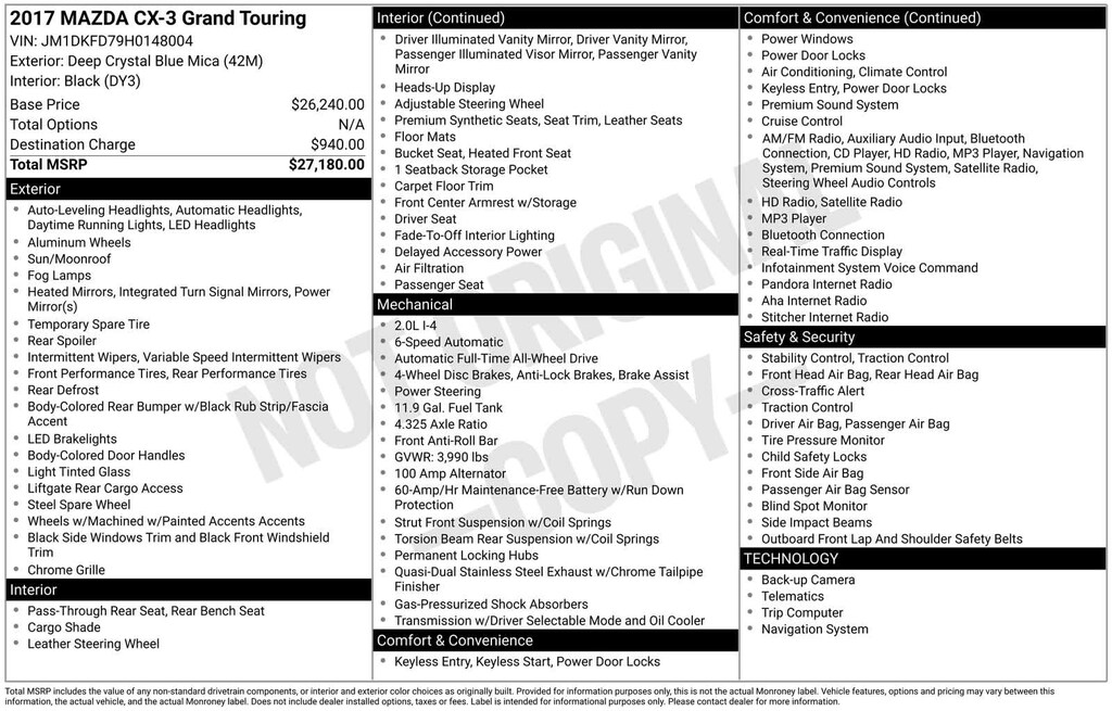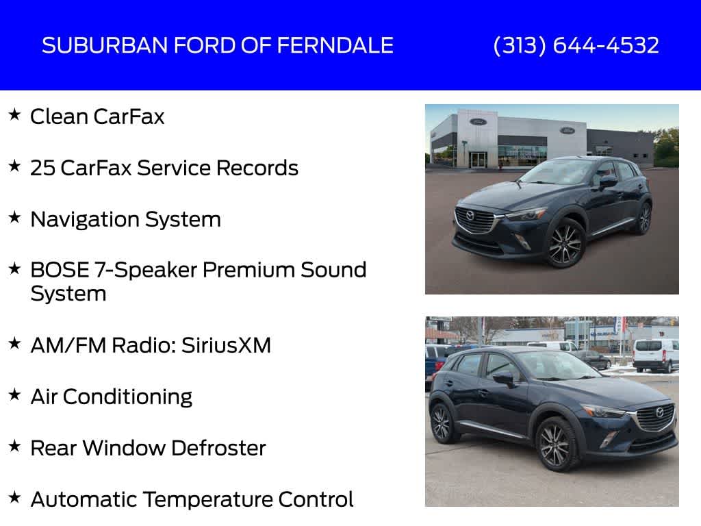 Deep Crystal Blue Mica 2017 Mazda CX-3 Grand Touring AWD 6-Speed Automatic SKYACTIVî-G 2.0L 4-Cylinder DOHC 16V Clean CarFax, 25 CarFax Service Records, Air Conditioning, AM/FM Radio: SiriusXM, Automatic Temperature Control, BOSE 7-Speaker Premium Sound System, Exterior Parking Camera Rear, Heated External Mirrors, Heated Front Seats, Navigation System, Power Door Mirrors, Power Moonroof, Rear Window Defroster.