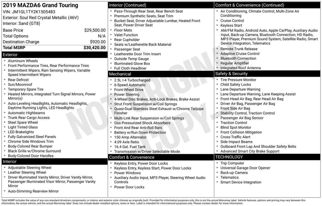 Wilde East Towne Honda is Your Destination Dealership in Madison!!, REWARD YOURSELF TODAY!!, **CALL NOW 608.402.8200!!, WE WELCOME ALL TRADE-INS!!, **KBB Fair Trade sale, vehicle must be 2012 or newer and be in running condition., Besides many of the features just listed, this Mazda Mazda6 also may have many of the following;, Anti-whiplash front head restraints, Dual front impact airbags, Dual front side impact airbags, Exterior Parking Camera Rear, Four wheel independent suspension, Power moonroof, Speed-sensing steering, Steering wheel mounted audio controls, 11 Speakers, 3-Level Heated Reclining Front Sport Bucket Seats, 4-Wheel Disc Brakes, ABS brakes, Air Conditioning, Alloy wheels, AM/FM radio: SiriusXM, AppLink/Apple CarPlay and Android Auto, Auto High-beam Headlights, Auto-dimming door mirrors, Auto-dimming Rear-View mirror, Automatic temperature control, Brake assist, Bumpers: body-color, Delay-off headlights, Driver door bin, Driver vanity mirror, Electronic Stability Control, Emergency communication system: MAZDA CONNECT, Front anti-roll bar, Front Bucket Seats, Front Center Armrest w/Storage, Front dual zone A/C, Front reading lights, Fully automatic headlights, Garage door transmitter: HomeLink, Heated door mirrors, Heated front seats, Illuminated entry, Leather Shift Knob, Leatherette Seat Trim, Low tire pressure warning, Occupant sensing airbag, Outside temperature display, Overhead airbag, Overhead console, Panic alarm, Passenger door bin, Passenger vanity mirror, Power door mirrors, Power driver seat, Power steering, Power windows, Radio data system, Radio: AM/FM/HD, Rain sensing wipers, Rear anti-roll bar, Rear reading lights, Rear seat center armrest, Rear window defroster, Remote keyless entry, Speed control, Split folding rear seat, Tachometer, Telescoping steering wheel, Tilt steering wheel, Traction control, Trip computer, Turn signal indicator mirrors, Variably intermittent wipers, Wheels: 19 Alloy w/Gun Metallic Finish, Anti-whiplash front head restraints, Dual front impact airbags, Dual front side impact airbags, Exterior Parking Camera Rear, Four wheel independent suspension, Power moonroof, Speed-sensing steering, Steering wheel mounted audio controls.