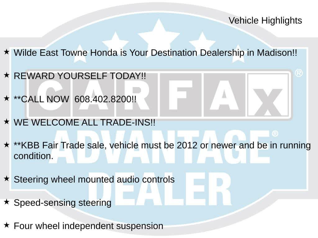 We would like to invite you out to Wilde East Towne Honda where you will experience a higher level of customer service. Exceptional service care that has helped us earn some prestigious awards. Honda President??s Award. Hondas highest level of achievement. DealerRater Dealer of the Year. Carfax customer service dealership of the year. Our family friendly staff look forward to serving all your automotive needs. Located on Madison??s East Side, we are just 2 miles South of Sun Prairie off Hwy 151/90/94. Some vehicles may be subject to manufacturer safety recalls that, for various reasons, may not be repaired prior to sale. You may also check for open re