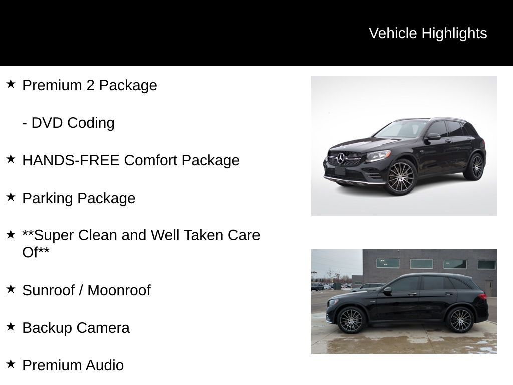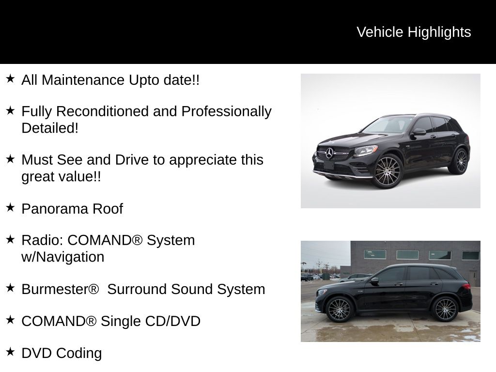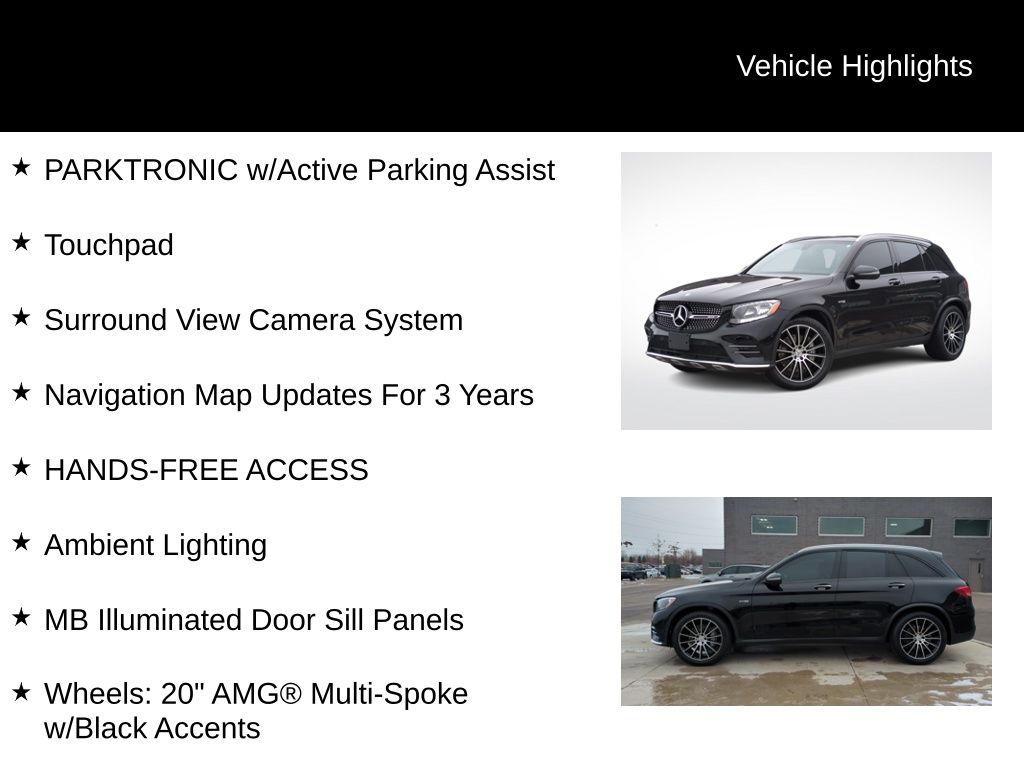 Clean CARFAX. 2017 Mercedes-Benz GLC 43 AMG® 4MATIC® Is nicely equipped with Advanced Parking Assistance Package (HANDS-FREE ACCESS, PARKTRONIC w/Active Parking Assist, and Surround View Camera System), HANDS-FREE Comfort Package, Parking Package, Premium 2 Package (Ambient Lighting, COMAND® Single CD/DVD, DVD Coding, MB Illuminated Door Sill Panels, Navigation Map Updates For 3 Years, Radio: COMAND® System w/Navigation, and Touchpad), Storage Package, Burmester® Surround Sound System, Panorama Roof, Wheels: 20" AMG® Multi-Spoke w/Black Accents, 3.69 Axle Ratio, 4-Wheel Disc Brakes, 6 Speakers, ABS brakes, Adaptive suspension, Air Conditioning, Alloy wheels, AM/FM radio: SiriusXM, Anti-whiplash front head restraints, Auto tilt-away steering wheel, Auto-dimming door mirrors, Auto-dimming Rear-View mirror, Auto-leveling suspension, Automatic temperature control, Brake assist, Bumpers: body-color, CD player, Child-Seat-Sensing Airbag, Delay-off headlights, Driver door bin, Driver vanity mirror, Dual front impact airbags, Dual front side impact airbags, Electronic Stability Control, Emergency communication system: mbrace, Exterior Parking Camera Rear, Four wheel independent suspension, Front anti-roll bar, Front Bucket Seats, Front Center Armrest, Front dual zone A/C, Front Power-Adjustable Bucket Seats w/Memory, Front reading lights, Fully automatic headlights, Garage door transmitter: Homelink, Heated door mirrors, Heated front seats, Illuminated entry, Knee airbag, Leather steering wheel, Low tire pressure warning, Memory seat, Occupant sensing airbag, Outside temperature display, Overhead airbag, Overhead console, Panic alarm, Passenger door bin, Passenger vanity mirror, Power adjustable front head restraints, Power door mirrors, Power driver seat, Power Liftgate, Power passenger seat, Power steering, Power windows, Premium audio system: COMAND®, Radio data system, Radio: Audio 20 w/Single CD/DVD, Rain sensing wipers, Rear anti-roll bar, Rear fog lights, Rear reading lights, Rear seat center armrest, Rear window defroster, Rear window wiper, Remote keyless entry, Roof rack: rails only, Security system, Speed control, Speed-sensing steering, Split folding rear seat, Sport steering wheel, Steering wheel memory, Steering wheel mounted audio controls, Tachometer, Telescoping steering wheel, Tilt steering wheel, Traction control, Trip computer, Turn signal indicator mirrors, Variably intermittent wipers, and Weather band radio.