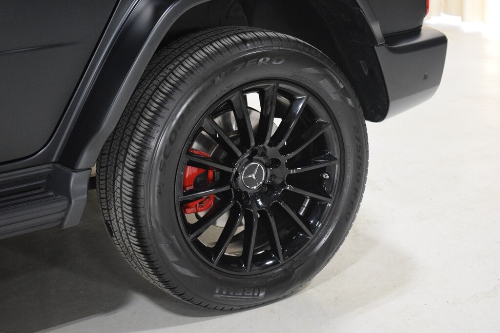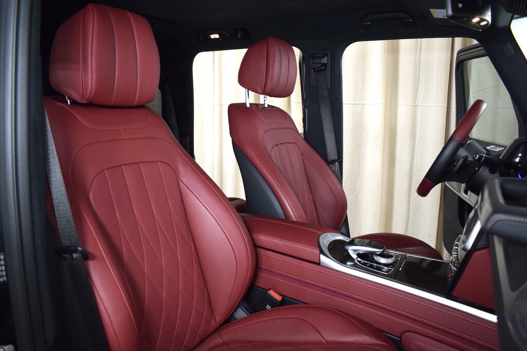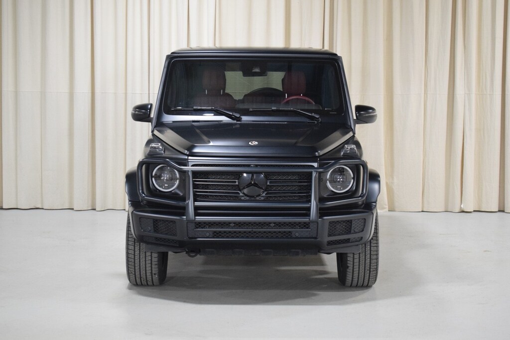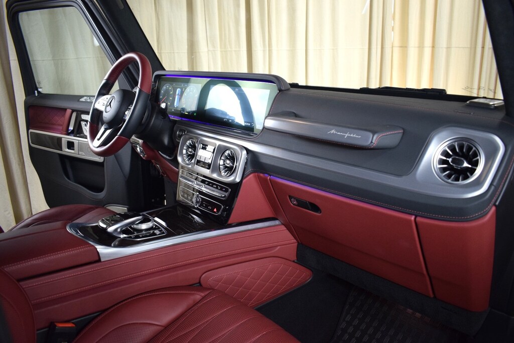 2024 Mercedes-Benz G 550 W4 in Night Black Magno exterior with Red Leather interior. The Mercedes-Benz G 550 W4 features a 4.0L Twin-Turbo V8 engine with 416 hp.