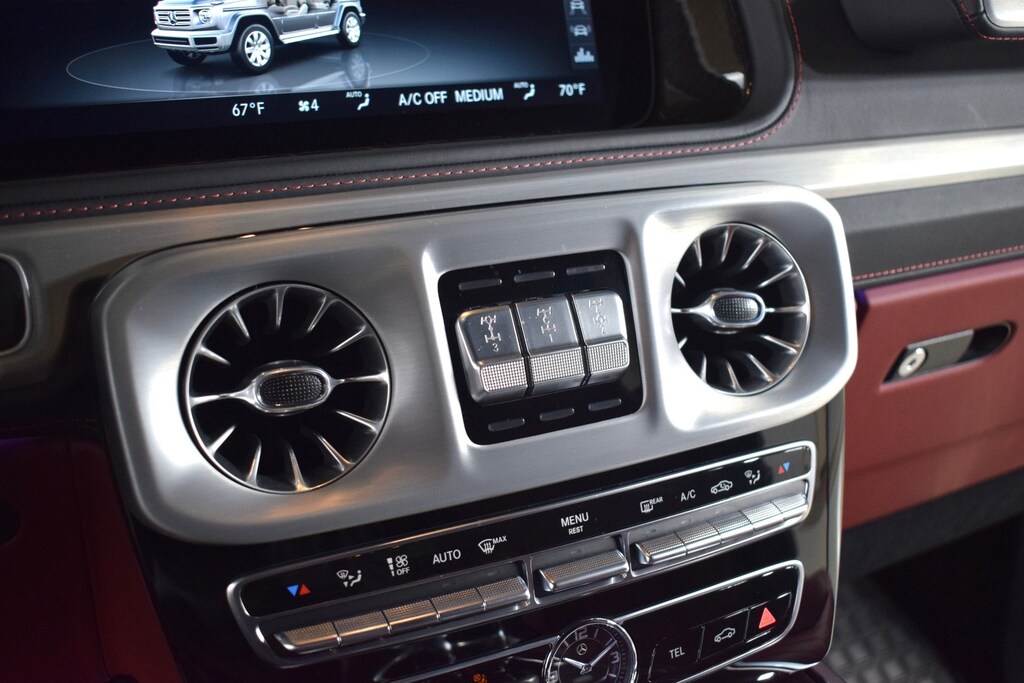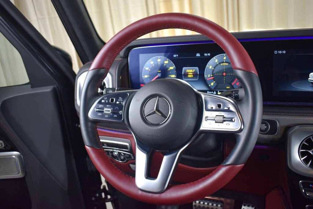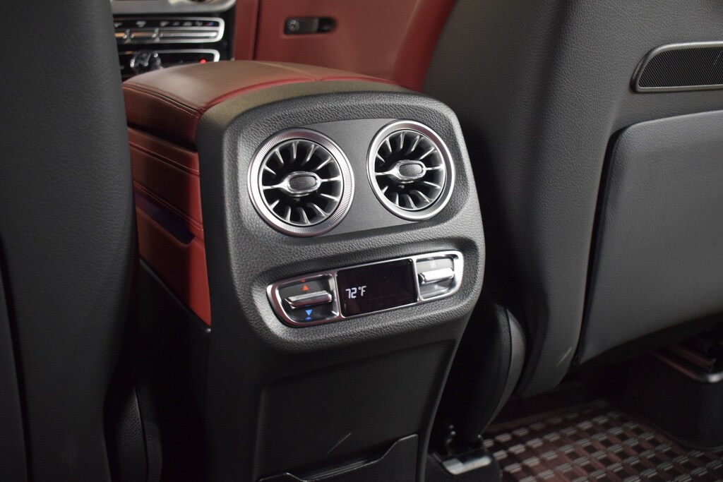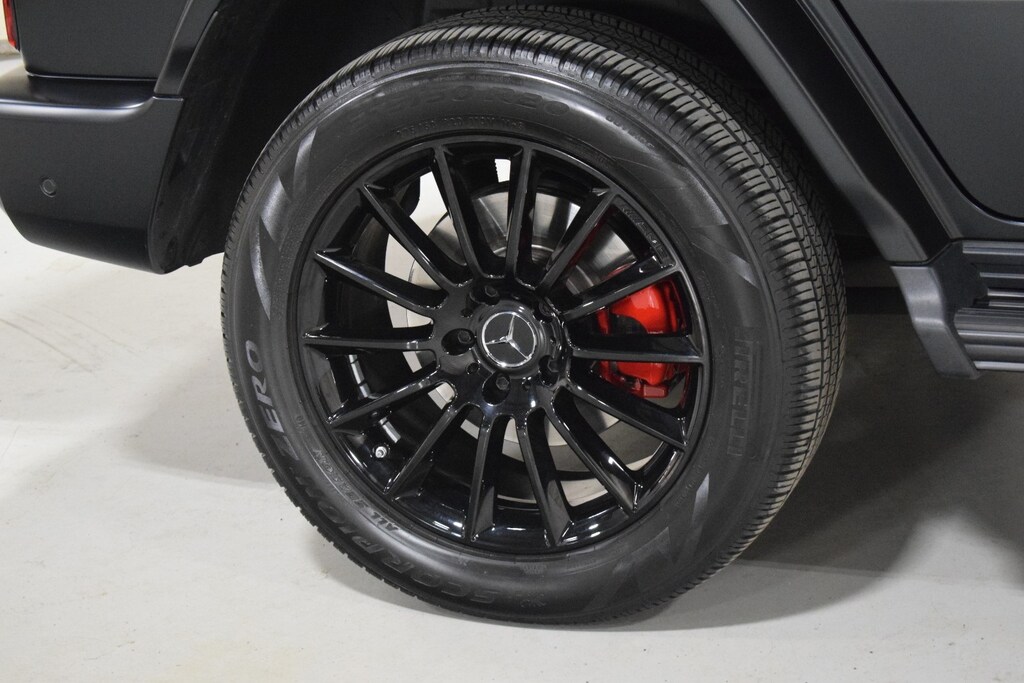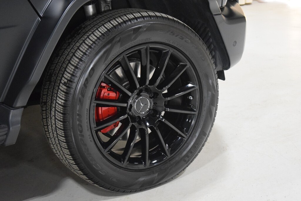 2024 Mercedes-Benz G 550 W4 in Night Black Magno exterior with Red Leather interior. The Mercedes-Benz G 550 W4 features a 4.0L Twin-Turbo V8 engine with 416 hp.