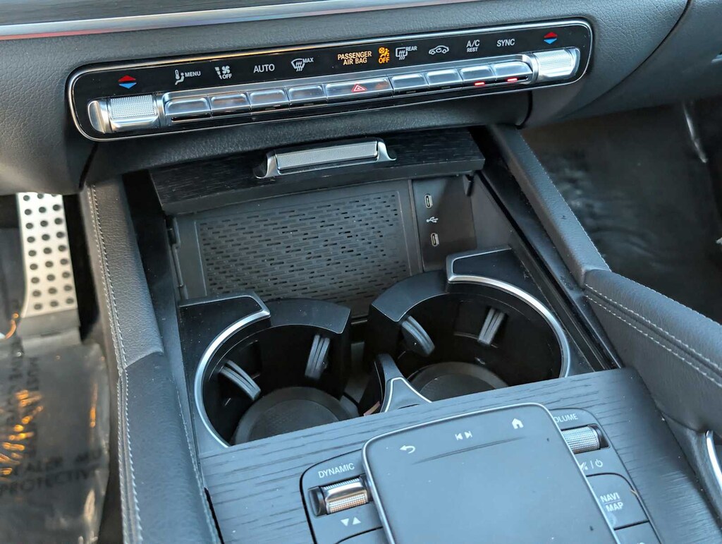 Spacious seven-passenger configuration with power-folding third-row seating. Heated and ventilated front seats with memory settings, four-way lumbar support, and passenger seat weight sensing. Dual 12.3-inch digital displays including a fully digital instrument cluster and center touchscreen. MBUX multimedia system with Apple CarPlay, Android Auto, wireless charging, NFC pairing, fingerprint sensor, sound personalization, and multiple USB ports throughout the cabin. Five-zone automatic climate control ensures comfort for every passenger.