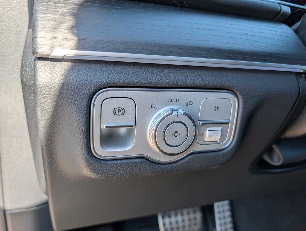 Obsidian Black Metallic exterior with AMG Line Exterior and Night Package styling elements. Black MB-Tex interior with premium materials, chrome interior accents, and natural grain Grey Oak wood trim. Panorama sunroof, power-folding mirrors with logo projectors, hands-free access power liftgate, and soft-close doors enhance everyday luxury. Burmester Surround Sound System paired with MBUX Navigation Premium, augmented video navigation, live traffic, and digital extras delivers an immersive driving experience. Advanced Driver Assistance Package with DISTRONIC adaptive cruise control, Active Steering Assist, Active Lane Change Assist, and extended stop-and-go functionality.