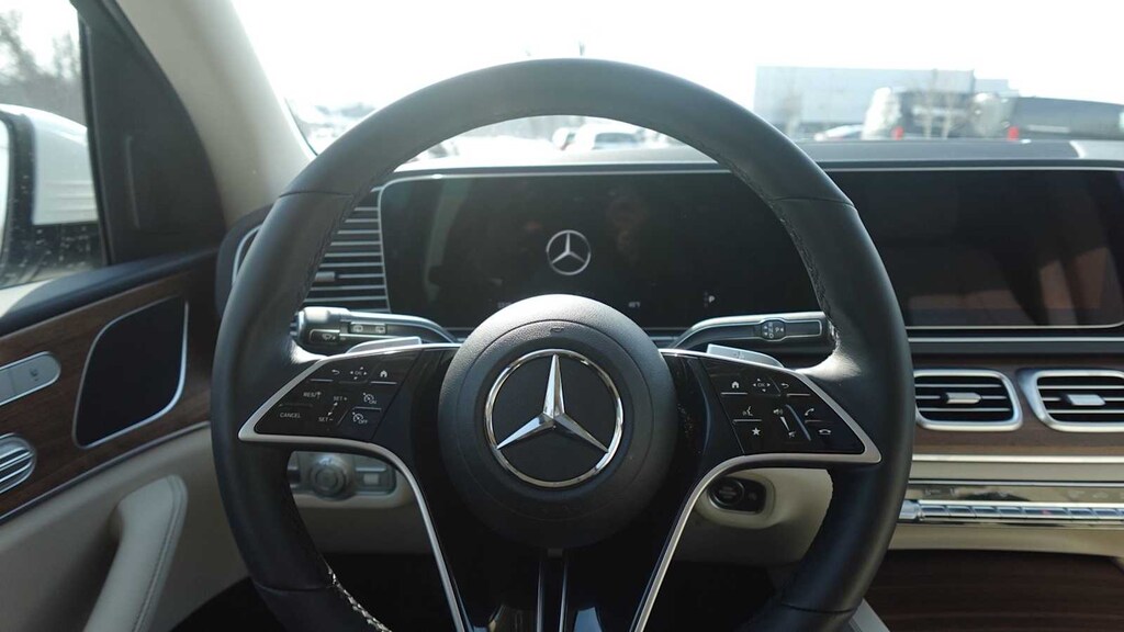 Inside, the cabin is elegant and highly functional, highlighted by MBUX Navigation Premium, live traffic, a 12.3-inch center display, and advanced digital extras including remote services and fingerprint authentication. Comfort features include heated front seats, heated steering wheel, dual-zone climate control, KEYLESS-GOî, hands-free access, and a power liftgate, all wrapped in a warm, upscale interior accented by Natural Grain Brown Walnut wood trim and a Nappa leather steering wheel.