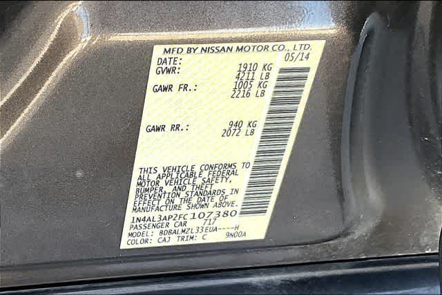 FRESH OIL CHANGE, CVT with Xtronic, 17 x 7.5 Aluminum Wheels, 4-Wheel Disc Brakes, 6 Speakers, ABS brakes, Activation Disclaimer, Air Conditioning, Alloy wheels, AM/FM radio: SiriusXM, Auto-Dimming Rear-View Mirror, Automatic temperature control, Blind Spot Warning, Brake assist, Bumpers: body-color, CD player, Cloth Seat Trim, Compass, Convenience Package, Delay-off headlights, Driver door bin, Driver vanity mirror, Dual front impact airbags, Dual front side impact airbags, Electronic Stability Control, Exterior Parking Camera Rear, Floor Mats Plus Trunk Mat (5 Piece), Four wheel independent suspension, Front anti-roll bar, Front Bucket Seats, Front Center Armrest w/Storage, Front dual zone A/C, Front fog lights, Front Passenger Window w/1-Touch Auto-Up/Down, Front reading lights, Fully automatic headlights, HomeLink Universal Transceiver, Illuminated entry, Lane Departure Warning System, Low tire pressure warning, Manual Folding Outside Mirrors, Nissan Navigation System, Occupant sensing airbag, Outside temperature display, Overhead airbag, Overhead console, Panic alarm, Passenger door bin, Passenger vanity mirror, Power door mirrors, Power driver seat, Power Sliding Moonroof w/Tilt, Power steering, Power windows, Radio data system, Radio: AM/FM/CD/MP3 Audio System w/SiriusXM, Rear anti-roll bar, Rear reading lights, Rear seat center armrest, Rear window defroster, Remote keyless entry, Security system, Side Cargo Net, Speed control, Speed-sensing steering, Speed-Sensitive Wipers, Splash Guards, Split folding rear seat, Steering wheel mounted audio controls, Tachometer, Technology Package, Telescoping steering wheel, Tilt steering wheel, Traction control, Trip computer, Variably intermittent wipers, CVT with Xtronic. 27/38 City/Highway MPG Java Metallic 2015 Nissan Altima 2.5 SV FWD CVT with Xtronic 2.5L I4 DOHC 16V