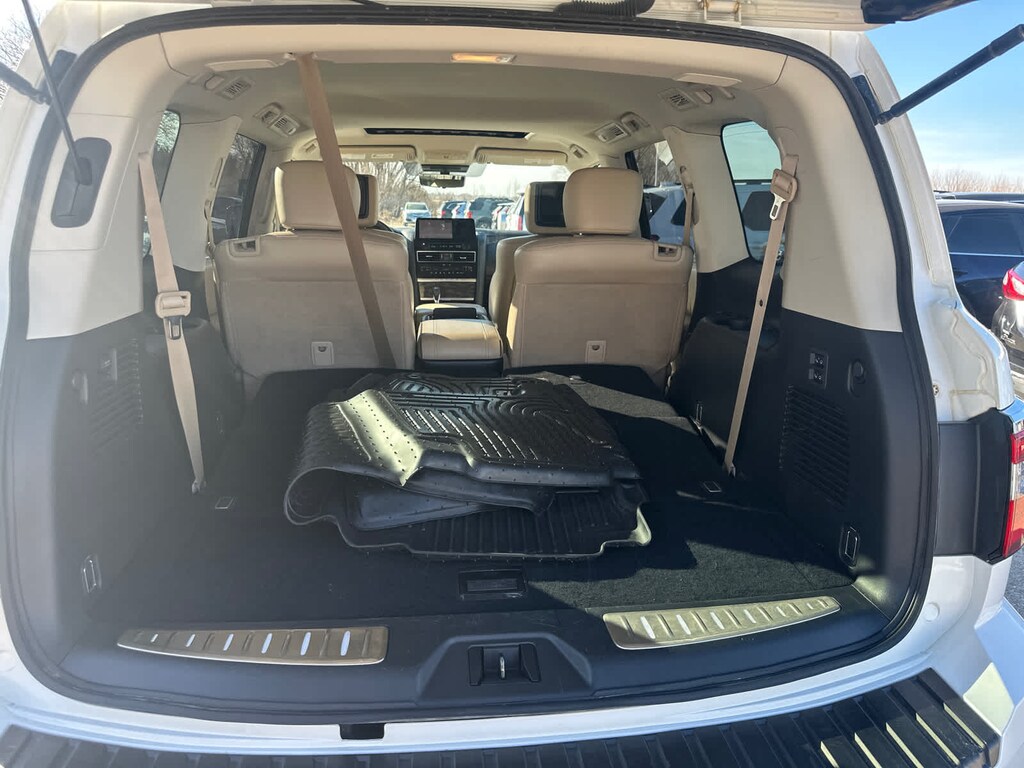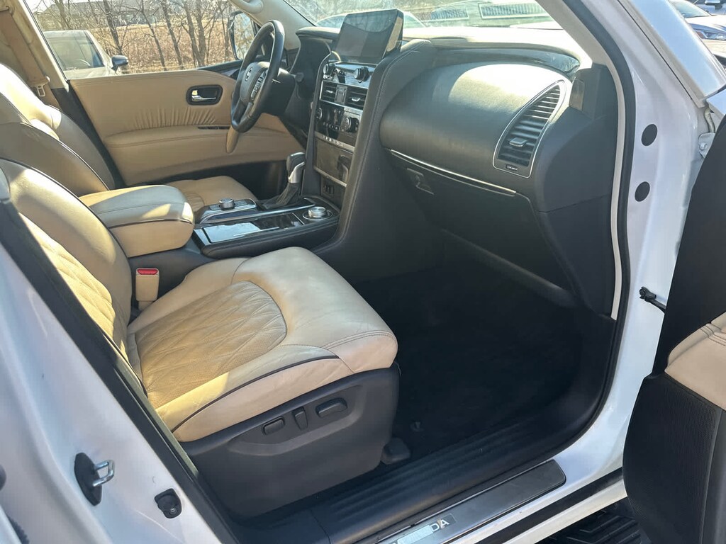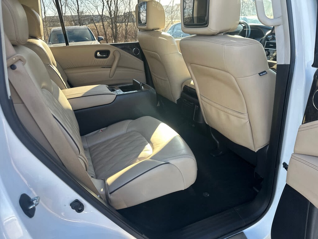 CAPTAINS CHAIRS PACKAGE Seating revised from 8 to 7 passengers, 2nd Row Captains Chairs, 2nd Row Center Console w/Padded Armrest, CROSS BARS. Nissan Platinum with Aspen White Tricoat exterior and Almond interior features a 8 Cylinder Engine with 400 HP at 5800 RPM*.