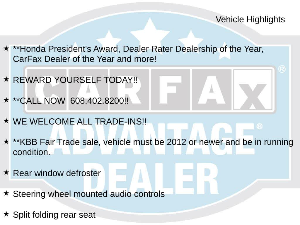 **Happy New Year!! Make your New Years Resolution to Spoil yourself with a New Car!!! To Celebrate were running $1000 over KBB Trade-in!! Stop in for your New or Used Honda, or anything in between and see why were Dealerrater Dealer of the Year! Honda Presidents Award Dealer, and Carfax Dealer of the year, come see for yourself why were rated one of Madisons Best and rated a 4.8/5 on 5000 reviews on Cars.com!!! Also Have Corporate discounts available, see a sales associate for details.