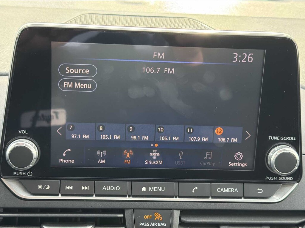 Altima 2.5 SV is nicely equipped with Altima 2.5 SV, 4D Sedan, 2.5L 4-Cylinder DOHC 16V, CVT with Xtronic, FWD, Charcoal w/Cloth Seat Trim, 17 Machined Alloy Wheels, 4-Wheel Disc Brakes, 6 Speakers, ABS brakes, Air Conditioning, Alloy wheels, AM/FM radio: SiriusXM, Auto High-beam Headlights, Blind Spot Warning, Brake assist, Bumpers: body-color, Cloth Seat Trim, Delay-off headlights, Driver door bin, Driver vanity mirror, Dual front impact airbags, Dual front side impact airbags, Electronic Stability Control, Four wheel independent suspension, Front anti-roll bar, Front Bucket Seats, Front Center Armrest, Front reading lights, Fully automatic headlights, Illuminated entry, Knee airbag, Low tire pressure warning, NissanConnect featuring Apple CarPlay and Android Auto, Occupant sensing airbag, Outside temperature display, Overhead airbag, Overhead console, Panic alarm, Passenger door bin, Passenger vanity mirror, Power door mirrors, Power driver seat, Power steering, Power windows, Radio data system, Radio: AM/FM Audio System, Rear anti-roll bar, Rear Parking Sensors, Rear reading lights, Rear seat center armrest, Rear side impact airbag, Rear window defroster, Remote keyless entry, Security system, Speed control, Speed-sensing steering, Speed-Sensitive Wipers, Split folding rear seat, Steering wheel mounted audio controls, Tachometer, Telescoping steering wheel, Tilt steering wheel, Traction control, Trip computer, and Variably intermittent wipers.