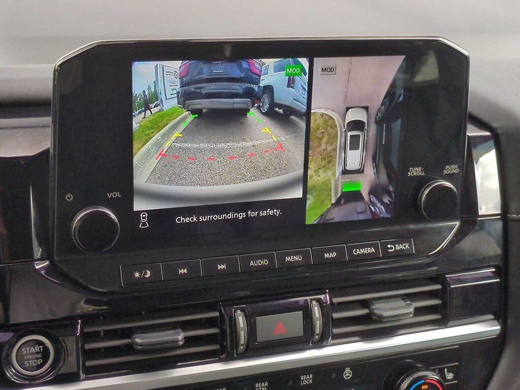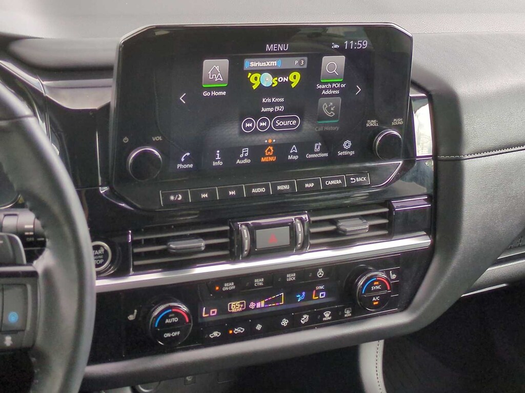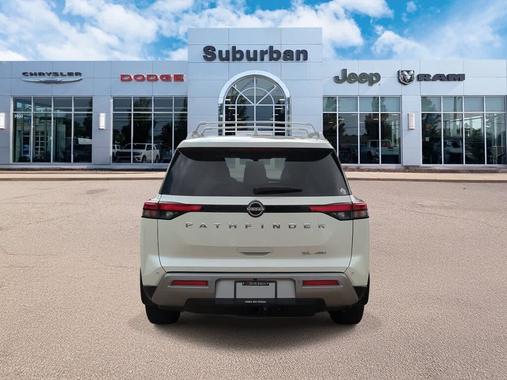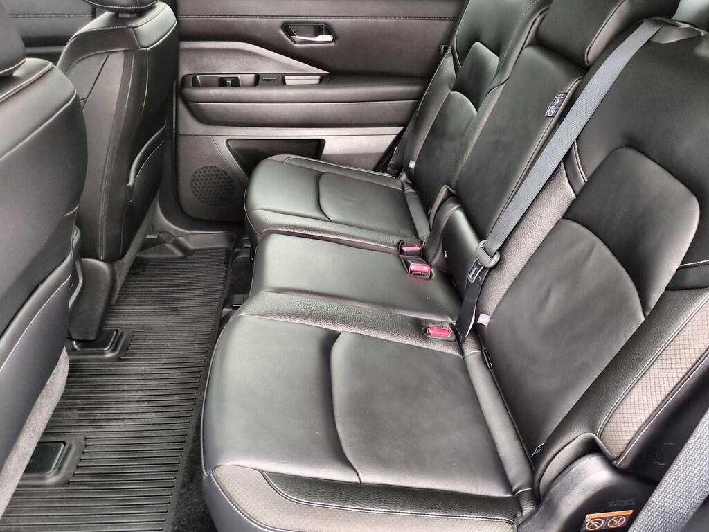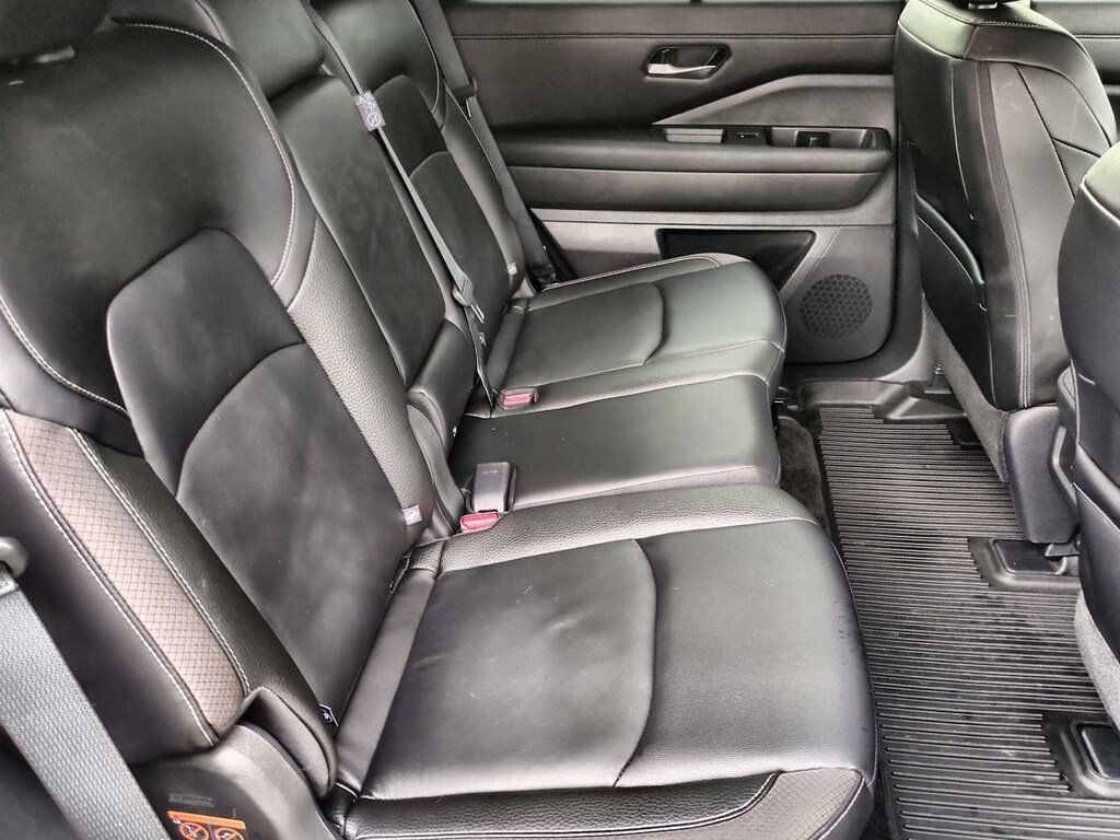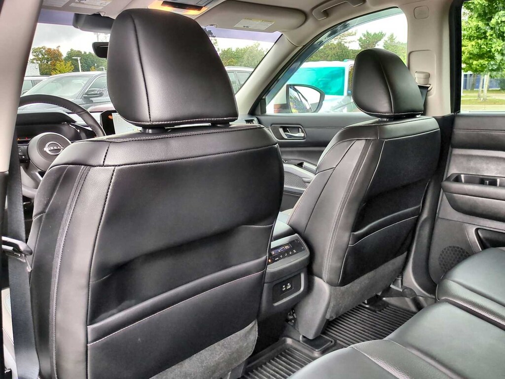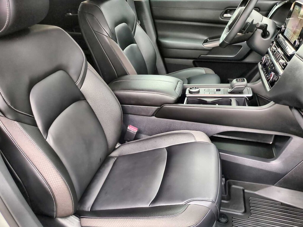 Pathfinder SL is nicely equipped with 4WD, 3rd row seats: bench, 4-Wheel Disc Brakes, 6 Speakers, ABS brakes, Air Conditioning, Alloy wheels, AM/FM radio: SiriusXM, Auto High-beam Headlights, Auto-dimming Rear-View mirror, Automatic temperature control, Axle Ratio: 4.334, Bench Seat Carpeted Floor Mats (Set of 4), Black Splash Guards (Set of 4), Brake assist, Bumpers: body-color, Cross Bars, Delay-off headlights, Driver door bin, Driver vanity mirror, Dual front impact airbags, Dual front side impact airbags, Electronic Stability Control, Emergency communication system, Exterior Parking Camera Rear, Four wheel independent suspension, Front anti-roll bar, Front Bucket Seats, Front Center Armrest, Front dual zone A/C, Front reading lights, Fully automatic headlights, Garage door transmitter: HomeLink, Heated door mirrors, Heated Front Bucket Seats, Heated front seats, Heated steering wheel, Illuminated entry, Knee airbag, Leather steering wheel, Leather-Appointed Seating Surfaces, Low tire pressure warning, Navigation system: NissanConnect with Navigation and Services, NissanConnect featuring Apple CarPlay and Android Auto, NissanConnect w/Navigation & Services, Occupant sensing airbag, Outside temperature display, Overhead airbag, Overhead console, Panic alarm, Passenger door bin, Passenger vanity mirror, Power door mirrors, Power driver seat, Power Liftgate, Power passenger seat, Power steering, Power windows, Radio data system, Radio: AM/FM Audio System, Rear air conditioning, Rear anti-roll bar, Rear reading lights, Rear seat center armrest, Rear side impact airbag, Rear window defroster, Rear window wiper, Reclining 3rd row seat, Remote keyless entry, Security system, Speed control, Speed-sensing steering, Split folding rear seat, Spoiler, Steering wheel mounted audio controls, Tachometer, Telescoping steering wheel, Tilt steering wheel, Traction control, Trip computer, Turn signal indicator mirrors, Variably intermittent wipers, and Wheels: 18 x 8J Machined Alloy.