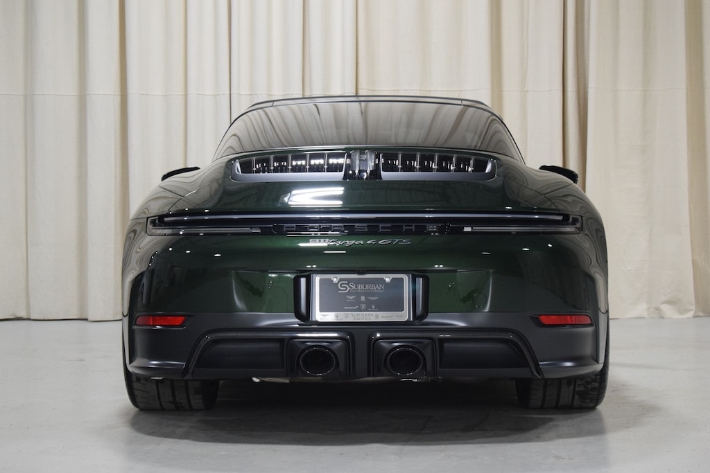 2026 Porsche 911 Targa 4 GTS in Jet Oak Green Metallic Neo exterior with Basalt and Cognac Leather interior. The Porsche 11 Targa 4 GTS features a 3.6L flat-six engine and a performance hybrid system with a combined output of 532 hp.