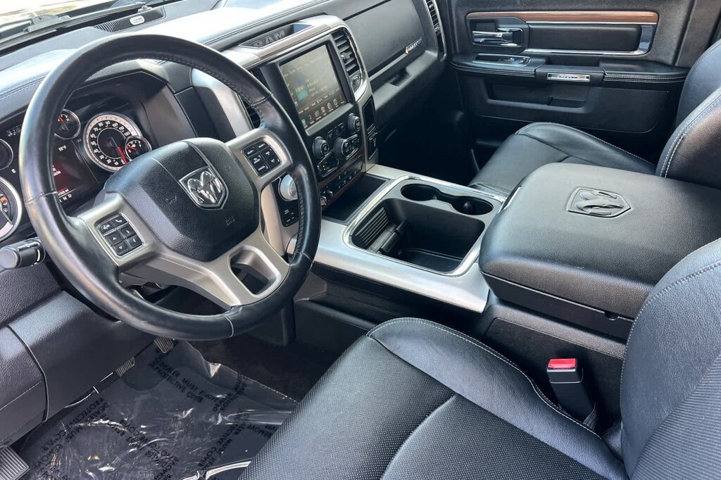This 1500 Laramie is finished in the Brilliant Black Crystal Pearlcoat exterior paint and Black Leather interior.