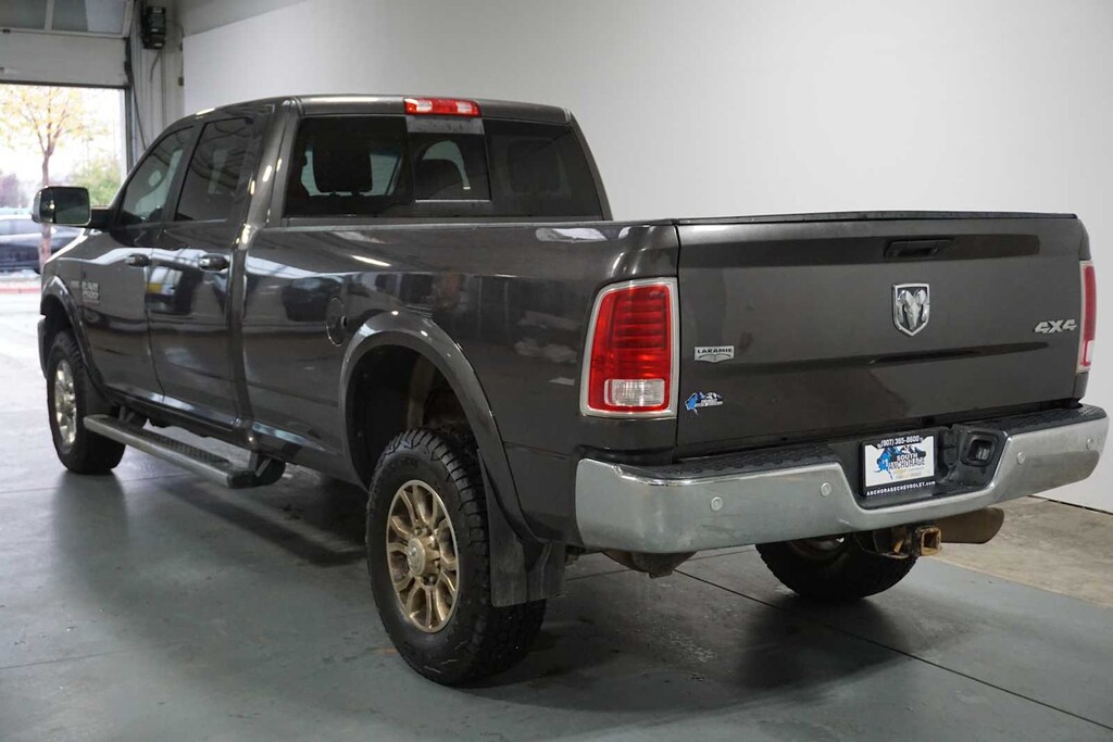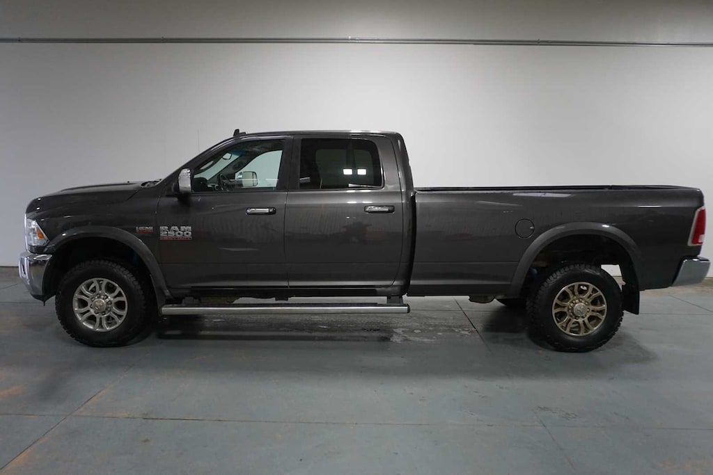 CHROME TUBULAR SIDE STEPS, BLACK, LEATHER TRIMMED BUCKET SEATS Power Lumbar Adjust, Bucket Seats, Heated Second Row Seats, High Back Seats, Rear 60/40 Split Folding Seat, Folding Flat Load Floor Storage, Ventilated Front Seats, Full Length Upgraded Floor Console, Power 10-Way Memory Driver & 6-Way Passenger Seats, SPRAY IN BEDLINER, REMOTE START SYSTEM, POWER FOLDING CHROME TRAILER TOW MIRRORS Exterior Mirrors w/Heating Element, Chrome Exterior Mirrors, Exterior Mirrors w/Memory, Exterior Mirrors w/Supplemental Signals, Exterior Mirrors Courtesy Lamps, Trailer Tow Mirrors, TRANSMISSION: 6-SPEED AUTOMATIC (66RFE) (STD), ENGINE: 6.4L HEAVY DUTY V8 HEMI W/MDS 11.50 Rear Axle, 180 Amp Alternator, 5.2 Additional Gallons of Gas, Electronically Controlled Throttle, GVWR: 10,000 lbs, Next Generation Engine Controller, Hemi Badge. Ram Laramie with Granite Crystal Metallic Clearcoat exterior and Black interior features a 8 Cylinder Engine with 410 HP at 5600 RPM*.