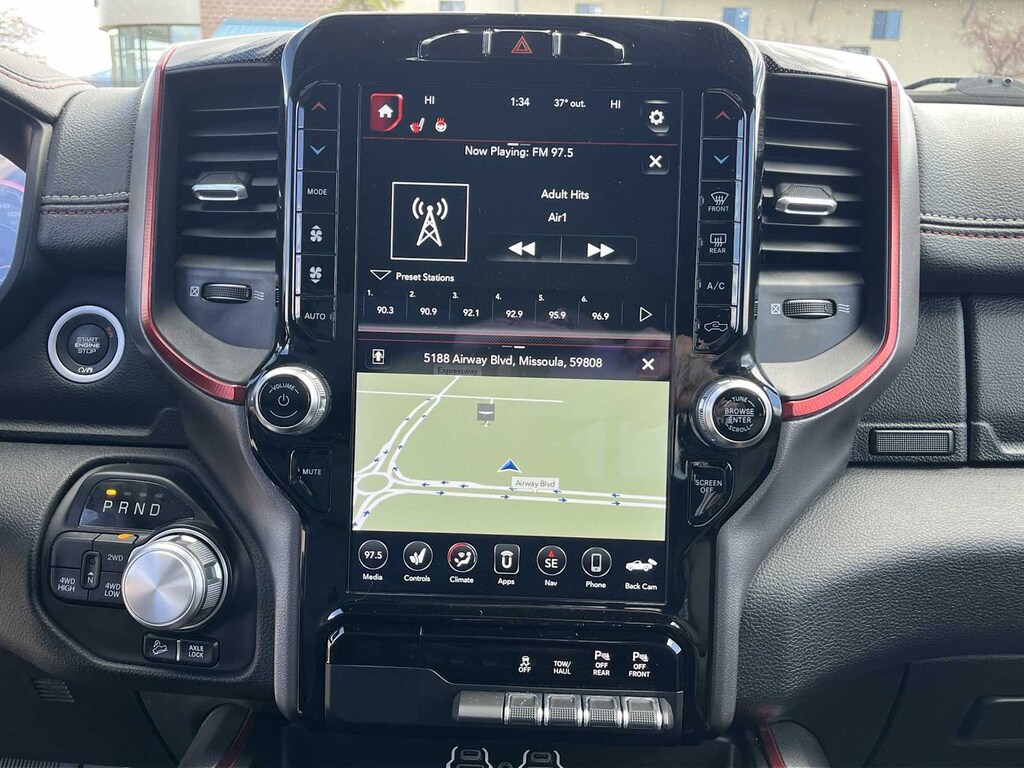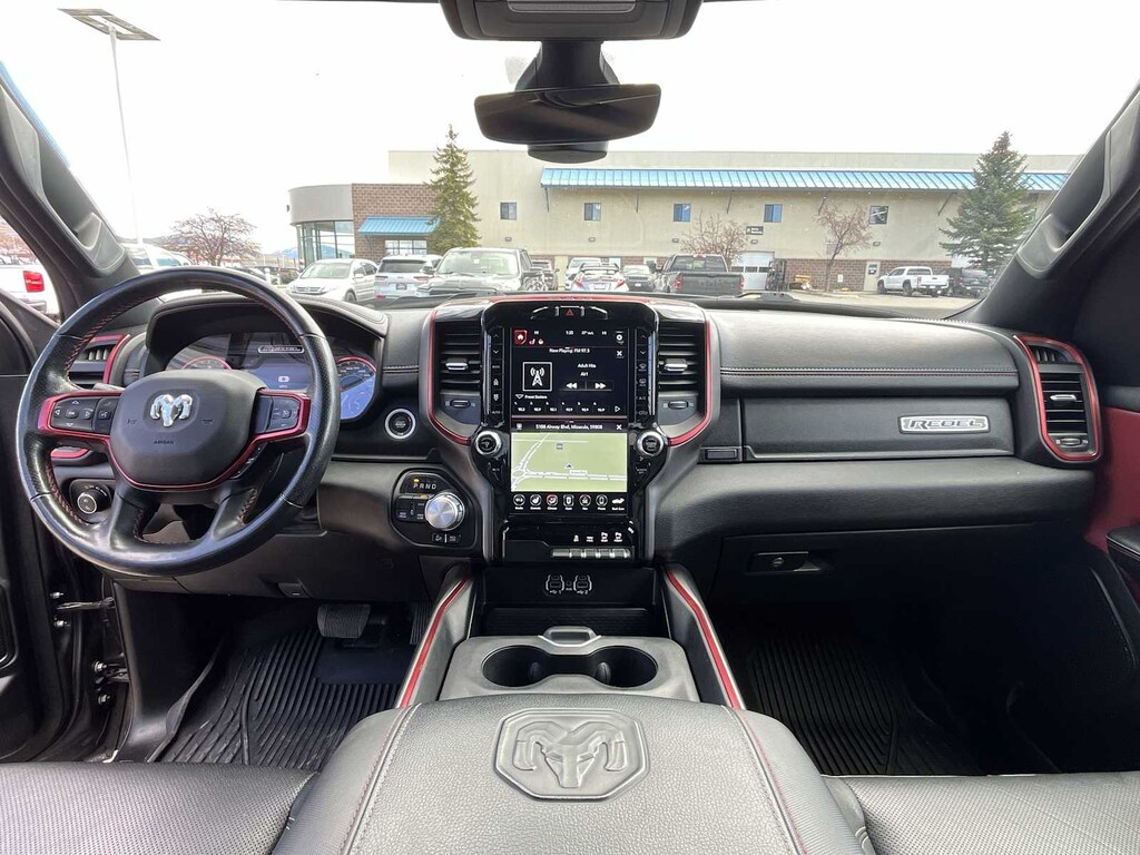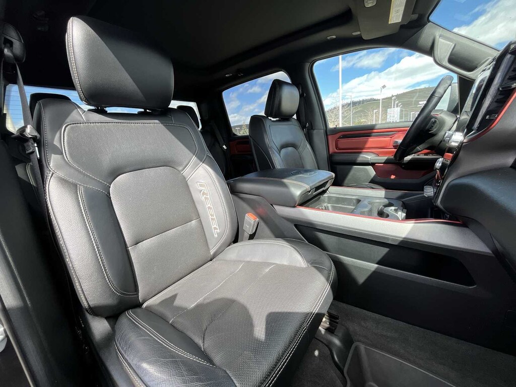 LEVEL 2 EQUIPMENT GROUP Remote Start System, Rear Window Defroster, Rain-Sensing Windshield Wipers, Auto-Dimming Rearview Mirror, Park-Sense Front & Rear Park Assist, Power Adjustable Pedals, Rear Dome Lamp w/On/Off Switch, A/C w/Dual-Zone Automatic Temperature Control, 115V Rear Auxiliary Power Outlet, Rear Media Hub w/2 USB Ports, Rear Underseat Compartment Storage, Remote Proximity Keyless Entry, Universal Garage Door Opener, Front Heated Seats, Heated Steering Wheel, Door Trim Panel Foam Bottle Insert, Security Alarm, Sun Visors w/Illuminated Vanity Mirrors, ALPINE LEATHER & SOUND GROUP W/2_W 9 Alpine Speakers w/Subwoofer, Radio: Uconnect 4C Nav w/12 Display, Google Android Auto®, SiriusXM Traffic, Disassociated Touchscreen Display, HD Radio, For Details Visit DriveUconnect.ca, 12 Touchscreen, 5-Year SiriusXM Travel Link Subscription, GPS Navigation, 5-Year SiriusXM Traffic Subscription, SiriusXM Travel Link, 4G LTE Wi-Fi Hot Spot, SiriusXM w/360L On-Demand Content, LED Footwell Lighting, QUICK ORDER PACKAGE 25W REBEL Engine: 5.7L HEMI VVT V8 w/FuelSaver MDS, Transmission: 8-Speed Automatic, Black Rear Bumper, Rebel Instrument Cluster, 18 Full-Size Steel Spare Wheel, Exterior Mirrors w/Turn Signals, Vinyl Door Trim Panel, Body-Colour Door Handles, Exterior Mirrors w/Courtesy Lamps, Auto-Dimming Exterior Driver Mirror, Electronic Shift-On-The-Fly Partime Transfer Case, Off-Road Group, Power Folding Exterior Mirrors, Fuel Tank Skid Plate, Powder-Coated Front Bumper, Black Power Fold Heated Mirrors w/Signals, Hill Descent Control, DARK RUBY RED/BLACK, LUXURY LEATHER-FACED FRONT BUCKET SEATS Front Heated Seats, Heated Steering Wheel, Power 4-Way Front Passenger Lumbar Adjust, Power 8-Way Adjustable Front Seats, Full-Length Upgraded Floor Console, TRANSMISSION: 8-SPEED AUTOMATIC (STD), ENGINE: 5.7L HEMI VVT V8 W/FUELSAVER MDS 220 Amp Alternator (STD), POWER DUAL-PANE PANORAMIC SUNROOF Premium Overhead Console, LED Dual Dome Reading Lamps, Overhead LED Lamps, RADIO: UCONNECT 4C NAV W/12 DISPLAY Google Android Auto®, SiriusXM Traffic, Disassociated Touchscreen Display, HD Radio, For Details Visit DriveUconnect.ca, 12 Touchscreen, 5-Year SiriusXM Travel Link Subscription, GPS Navigation, 5-Year SiriusXM Traffic Subscription, SiriusXM Travel Link, 4G LTE Wi-Fi Hot Spot, SiriusXM w/360L On-Demand Content, LED Footwell Lighting. Ram Rebel with Granite Crystal Metallic exterior and Dark Ruby Red/Black interior features a 8 Cylinder Engine with 305 HP at 6400 RPM*.
