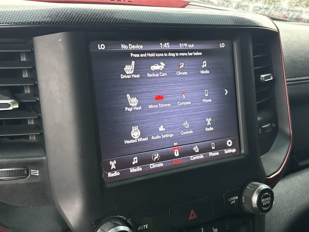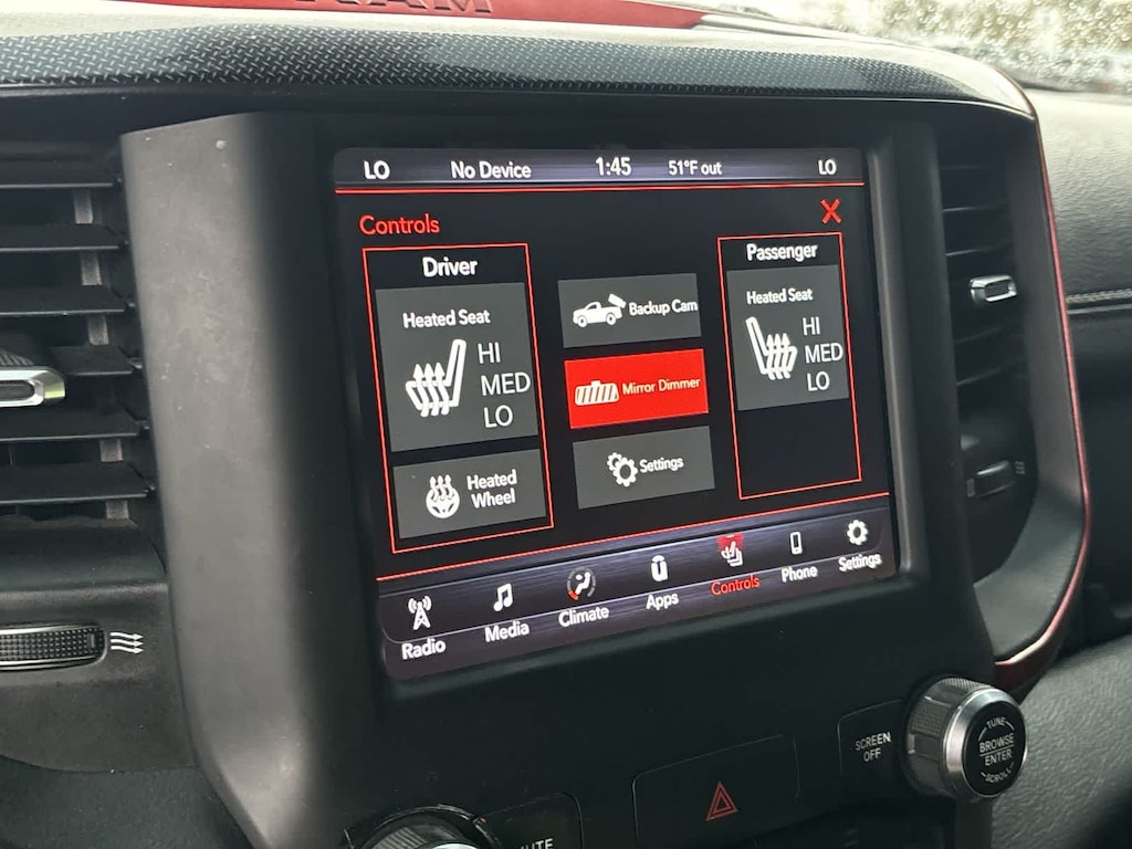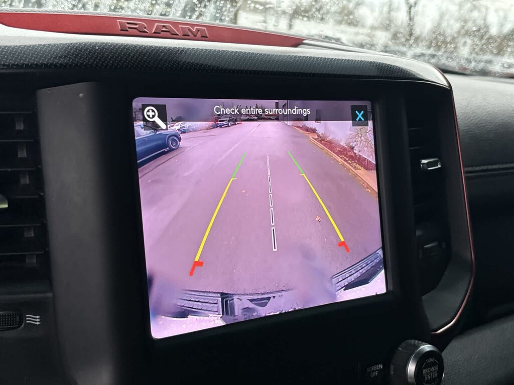 REBEL LEVEL 2 EQUIPMENT GROUP Radio: Uconnect 4 w/8.4 Display, Remote Start System, Rear Window Defroster, Rain Sensitive Windshield Wipers, ParkSense Front/Rear Park Assist w/Stop, Rear View Auto Dim Mirror, Power Adjustable Pedals, Rear Dome w/On/Off Switch Lamp, 115V Auxiliary Rear Power Outlet, 2 USB Full Function/Charge Only Media Hub, Rear Underseat Compartment Storage, Remote Proximity Keyless Entry, Universal Garage Door Opener, Heated Front Seats, Heated Steering Wheel, Foam Bottle Insert (Door Trim Panel), Single Disc Remote CD Player, Security Alarm, Black Premium Power Mirrors, Sun Visors w/Illuminated Vanity Mirrors, ENGINE: 5.7L V8 HEMI MDS VVT Active Noise Control System, Heavy Duty Engine Cooling, Dual Exhaust w/Black Tips, GVWR: 7,100 lbs, Hemi Badge, 220 Amp Alternator, REMOTE START SYSTEM, TRANSMISSION: 8-SPEED AUTOMATIC (8HP75). Ram Rebel with Bright White Clearcoat exterior and Red/Black interior features a 8 Cylinder Engine with 305 HP at 6400 RPM*.
