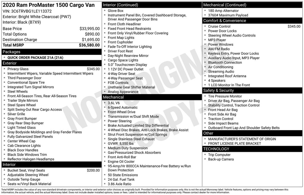 2020 Ram ProMaster 1500 Base Is nicely equipped with Quick Order Package 21A, 3.86 Axle Ratio, 4 Speakers, 4-Wheel Disc Brakes, 5.0" Touchscreen Display, ABS brakes, Air Conditioning, AM/FM radio, Bodyside moldings, Brake assist, Center Wheel Cap, Cloth Bucket Seats, Deep Tint Sunscreen Glass, Driver door bin, Dual front impact airbags, Dual front side impact airbags, Electronic Stability Control, Front anti-roll bar, Front Bucket Seats, Front License Plate Bracket, Front reading lights, Front wheel independent suspension, Illuminated entry, Integrated Voice Command w/Bluetooth, Low tire pressure warning, Manufacturer's Statement of Origin, Media Hub (USB, AUX), Media Input Hub, Medium Duty Suspension, Outside temperature display, Overhead airbag, ParkView Rear Back-Up Camera, Passenger door bin, Power steering, Power windows, Radio: Uconnect 3 w/5" Display, Rear Hinged Doors w/Fixed Glass, Remote keyless entry, Speed Control, Steering Wheel Mounted Audio Controls, Steering wheel mounted audio controls, Tachometer, Telescoping steering wheel, Traction control, Trip computer, Turn signal indicator mirrors, Variably intermittent wipers, and Wheels: 16" x 6.0" Steel.