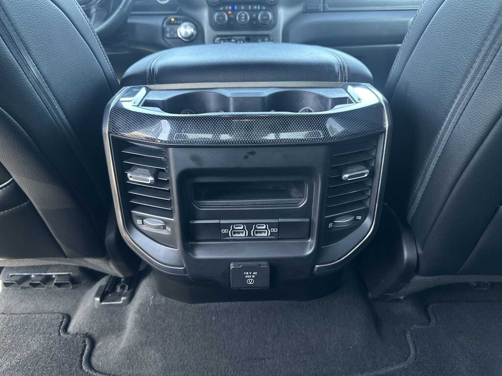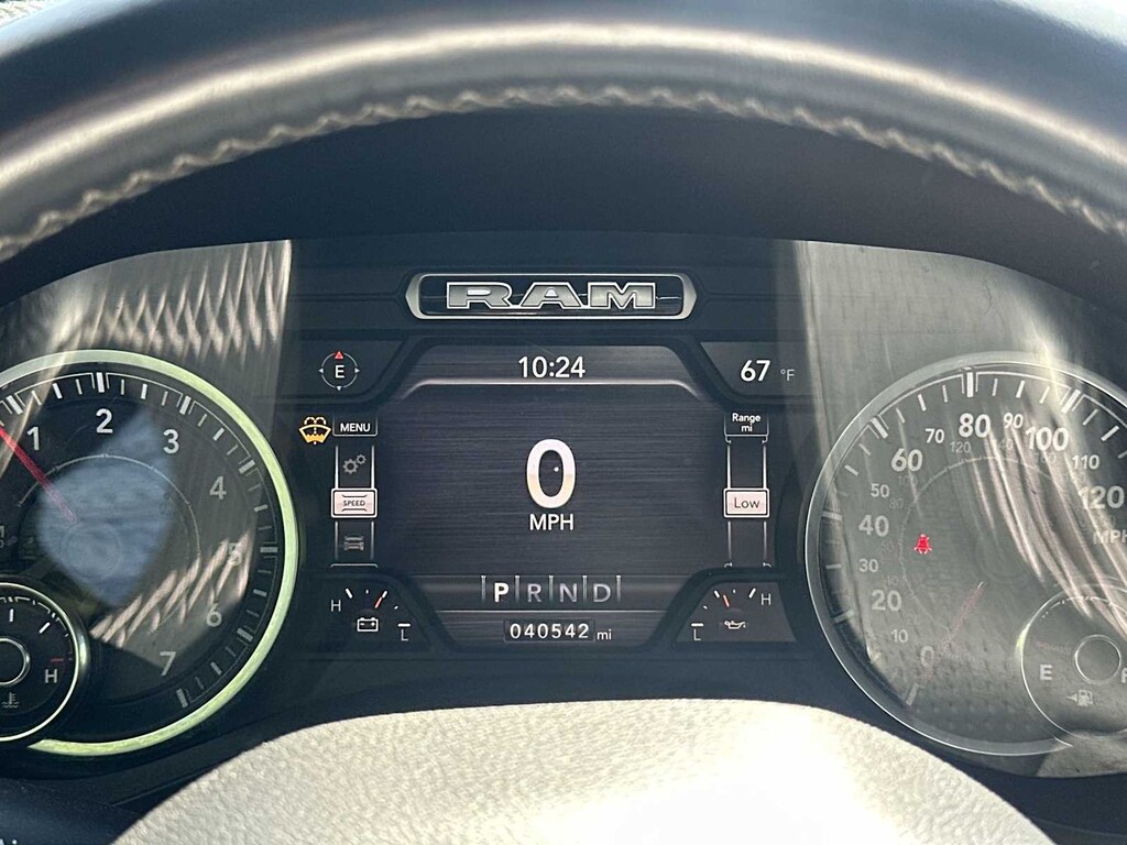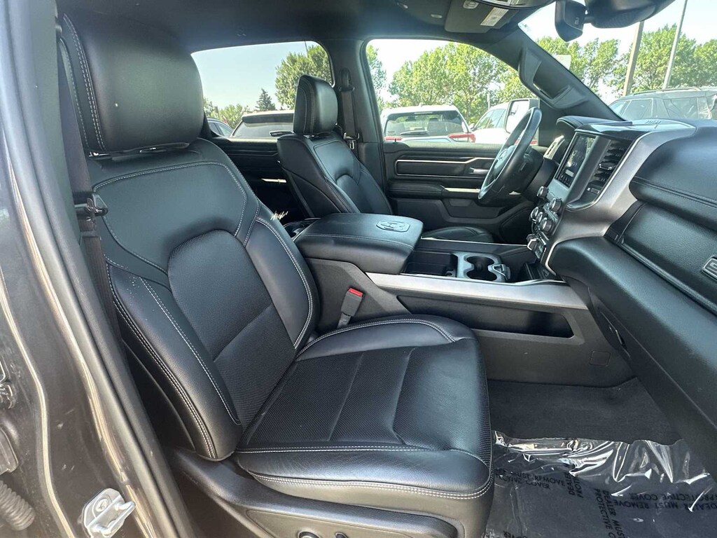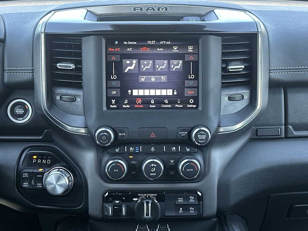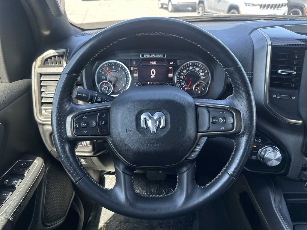 BLACK, LEATHER-FACED FRONT VENTED BUCKET SEATS Power 4-Way Front Passenger Lumbar Adjust, Power 8-Way Adjustable Front Seats, Front Ventilated Seats, LEVEL 2 EQUIPMENT GROUP Media Hub w/2 USB Charging Ports, Rear Underseat Compartment Storage, Remote Proximity Keyless Entry, Remote Start System, Rain-Sensing Windshield Wipers, Park-Sense Front & Rear Park Assist, Security Alarm, 115V Rear Auxiliary Power Outlet, ANTI-SPIN DIFFERENTIAL REAR AXLE, CLASS IV RECEIVER HITCH, REMOTE START SYSTEM, TRANSMISSION: 8-SPEED AUTOMATIC (STD), ENGINE: 5.7L HEMI VVT V8 W/FUELSAVER MDS Active Noise Control System, Heavy-Duty Engine Cooling, HEMI Badge, 220 Amp Alternator (STD). Ram Sport with Granite Crystal Metallic exterior and Black interior features a 8 Cylinder Engine with 395 HP at 5600 RPM*.