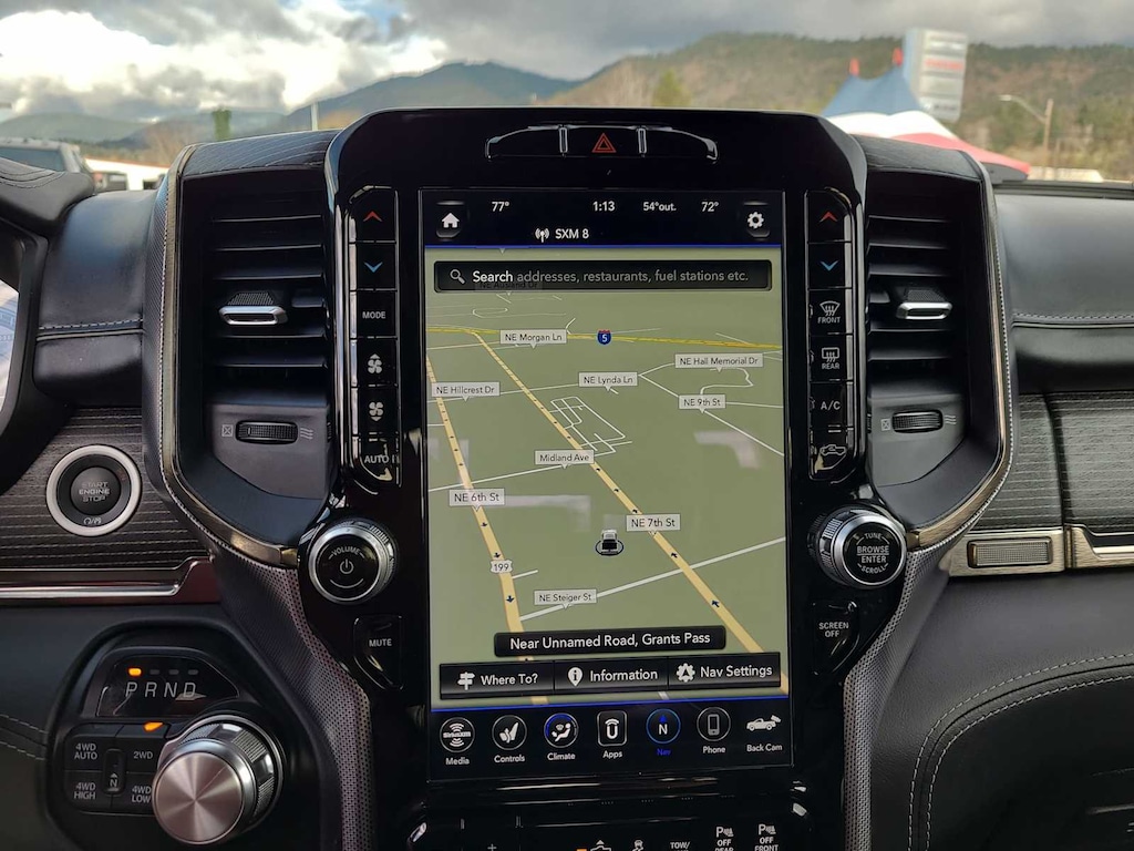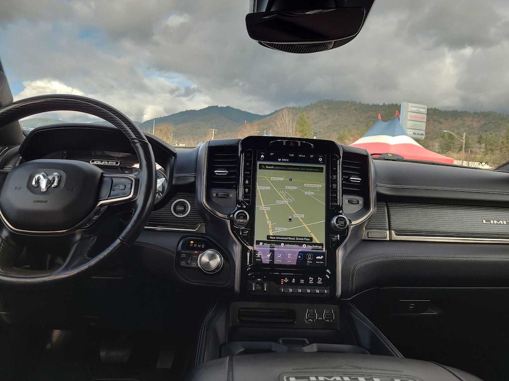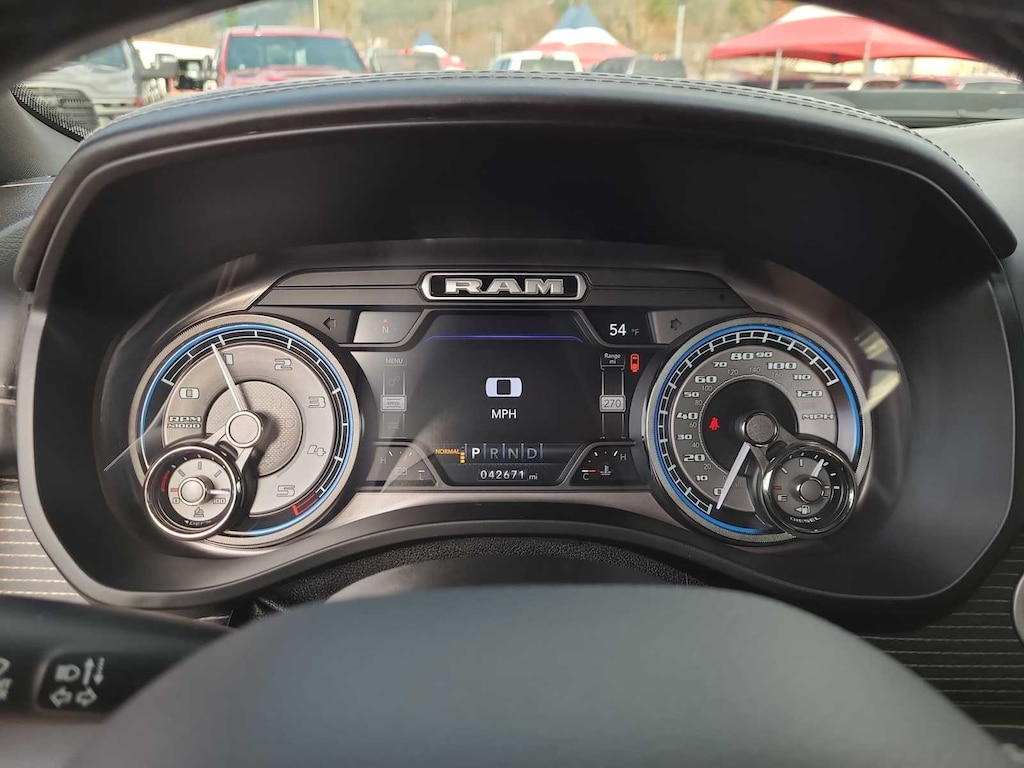 This vehicle is well equipped with many features including: Cold Weather Group (Engine Block Heater and MOPAR Winter Front Grille Cover), Night Edition (Accent Color Premium Power Mirrors, Black Day Light Opening Moldings, Black Exterior Truck Badging, Black Grille Surround Texture 7 Chrome, Black Headlamp Bezels, Black Painted Exterior Mirrors Caps, Body Color Door Handles, Body Color Front Bumper, Body Color Rear Bumper w/Step Pads, Dual Exhaust w/Black Tips, harman/kardon 19 Speaker Premium Sound, RAM Grille Badge - Black, Sport Performance Hood, Tow Hooks, Tri-Fold Tonneau Cover, and Wheels: 22 x 9 Black Aluminum), Quick Order Package 28M Limited, 10 Speakers, Front dual zone A/C, Leather steering wheel, and Navigation System. CARFAX One-Owner. Clean CARFAX.