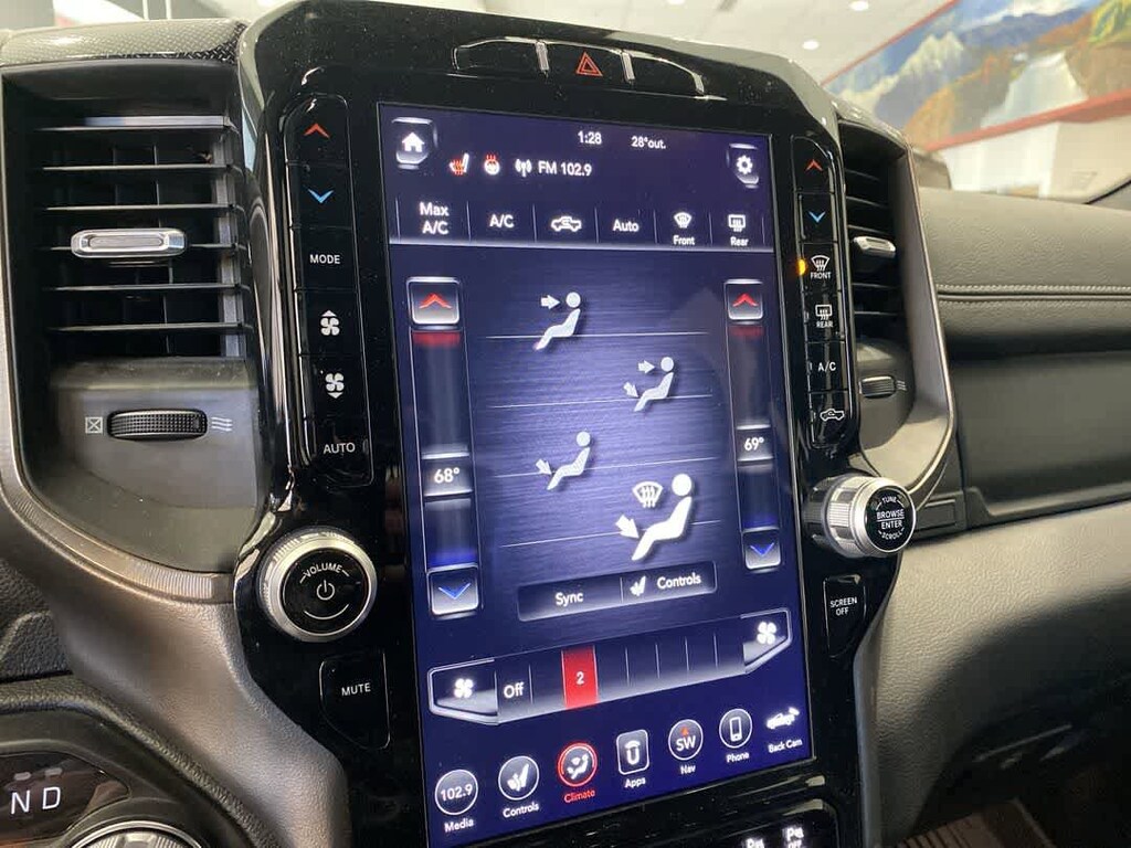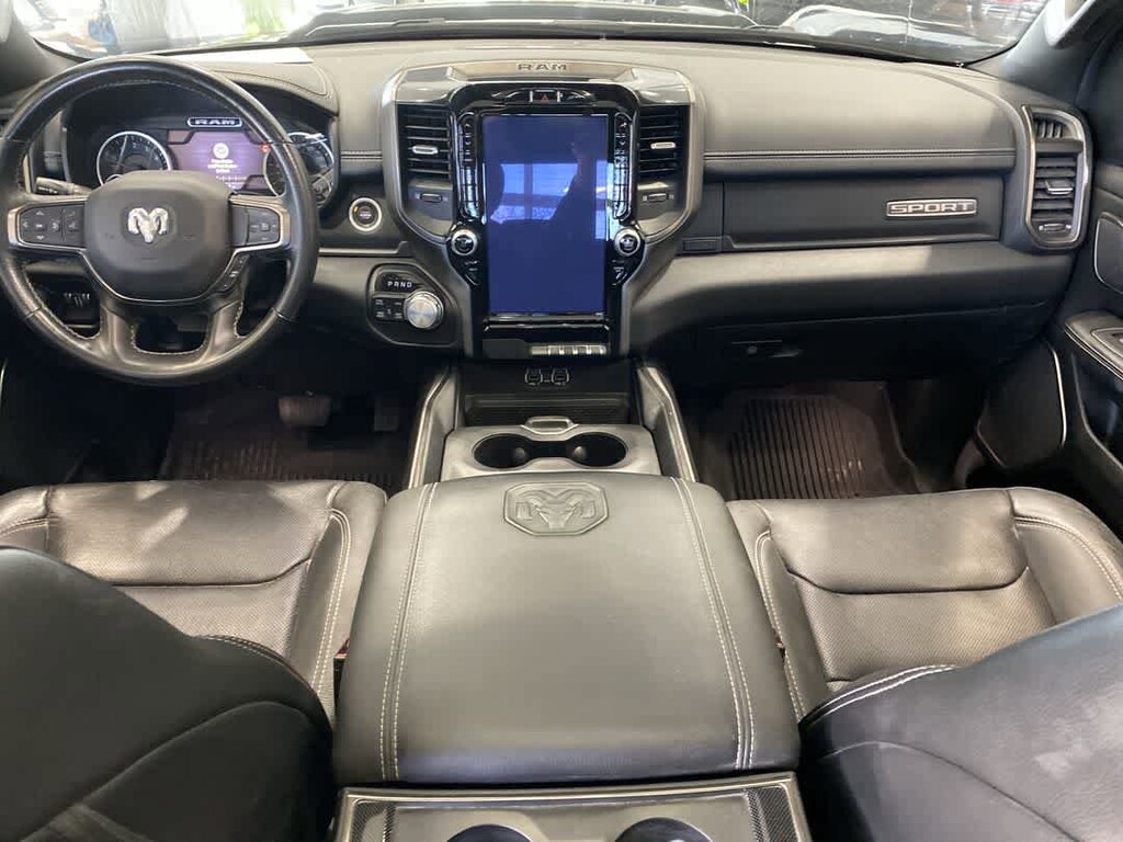 LEATHER & SOUND GROUP harman/kardon 19-Speaker Audio, Radio: Uconnect 4C Nav w/12 Display, SiriusXM Traffic, Disassociated Touchscreen Display, HD Radio, For Details Visit DriveUconnect.ca, 12 Touchscreen, A/C w/Dual-Zone Automatic Temperature Control, 5-Year SiriusXM Travel Link Subscription, GPS Navigation, 5-Year SiriusXM Traffic Subscription, SiriusXM Travel Link, 4G LTE Wi-Fi Hot Spot, SiriusXM w/360L On-Demand Content, LED Footwell Lighting, POWER DUAL-PANE PANORAMIC SUNROOF LED Dual Dome Reading Lamps, LEVEL 2 EQUIPMENT GROUP Media Hub w/2 USB Charging Ports, Rear Underseat Compartment Storage, Remote Proximity Keyless Entry, Remote Start System, Rain-Sensing Windshield Wipers, Park-Sense Front & Rear Park Assist, Security Alarm, 115V Rear Auxiliary Power Outlet, WHEELS: 22 X 9 POLISHED ALUMINUM Tires: 285/45R22XL BSW All-Season, ANTI-SPIN DIFFERENTIAL REAR AXLE, CLASS IV RECEIVER HITCH, BLACK, LEATHER-FACED FRONT VENTED BUCKET SEATS Power 4-Way Front Passenger Lumbar Adjust, Power 8-Way Adjustable Front Seats, Front Ventilated Seats, TRANSMISSION: 8-SPEED AUTOMATIC (STD), ENGINE: 5.7L HEMI VVT V8 W/FUELSAVER MDS Active Noise Control System, Heavy-Duty Engine Cooling, HEMI Badge, 220 Amp Alternator (STD). Ram Sport with Ivory Tri-Coat Pearl exterior and Black interior features a 8 Cylinder Engine with 395 HP at 5600 RPM*.