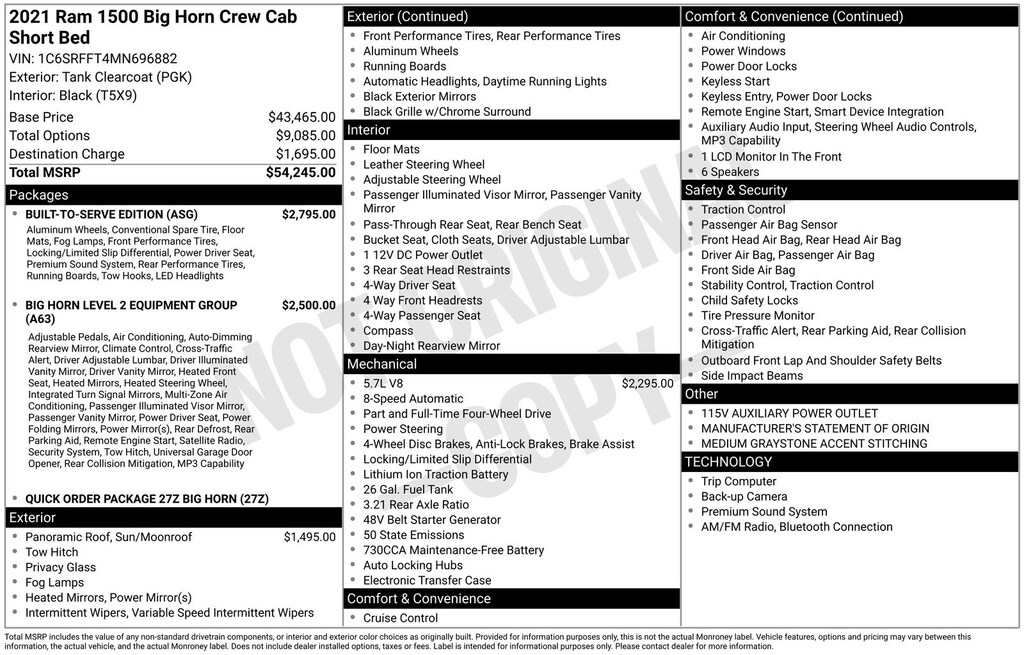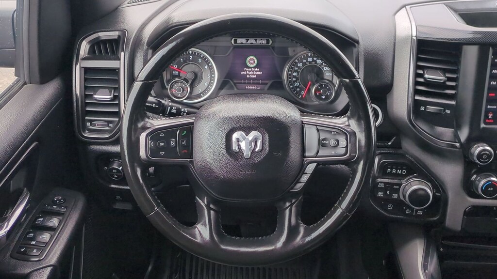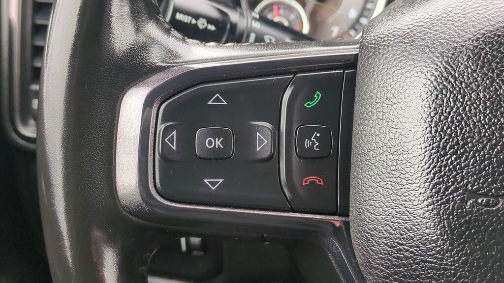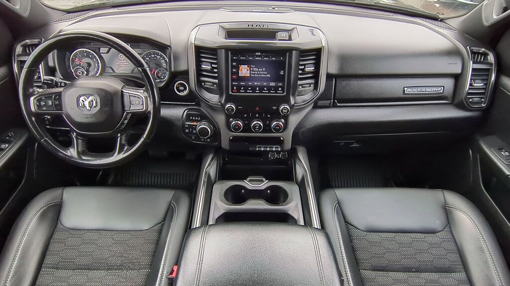 Clean CARFAX. 2021 Ram 1500 Big Horn/Lone Star Built to Serve Is nicely equipped with Big Horn Level 2 Equipment Group (115V Auxiliary Power Outlet, 115V Auxiliary Rear Power Outlet, 2nd Row In Floor Storage Bins, Air Conditioning ATC w/Dual Zone Control, Auto-Dimming Exterior Driver Mirror, Auto-Dimming Rear-View Mirror, Black Premium Power Mirrors, Class IV Receiver Hitch, Cluster 7.0" TFT Color Display, Exterior Mirrors Courtesy Lamps, Exterior Mirrors w/Supplemental Signals, Foam Bottle Insert (Door Trim Panel), For More Info, Call 800-643-2112, Glove Box Lamp, Heated Front Seats, Heated Steering Wheel, Media Hub w/2 Charge Only USBs, ParkSense Front/Rear Park Assist w/Stop, Power 4-Way Driver Lumbar Adjust, Power 8-Way Driver Seat, Power Adjustable Pedals, Power-Folding Mirrors, Rear Dome w/On/Off Switch Lamp, Rear Power Sliding Window, Rear Window Defroster, Security Alarm, SiriusXM Radio Service, Sun Visors w/Illuminated Vanity Mirrors, Universal Garage Door Opener, and 400W Inverter), Built-To-Serve Edition (20" x 9" Aluminum Wheels, 9 Amplified Speakers w/Subwoofer, Black Door Handles, Black Exterior Truck Badging, Black Front Bumper, Black Headlamp Bezels, Black Onyx Interior Accent, Black Rear Bumper, Body Color Fender Flares, Built-To-Serve Edition I/P Badge, Center Console Parts Module, Dual Exhaust w/Black Tips, E-Locker Rear Axle, Front Extra HD Shock Absorbers, Front LED Fog Lamps, Grille Surround 1 Black Texture 1 Black, Hill Descent Control, LED Reflector Headlamps, LED Taillamps, Mopar Black Tubular Side Steps, MOPAR Front & Rear Rubber Floor Mats, Premium Cloth/Vinyl Bucket Seats, RAM Grille Badge - Black, Rear Extra HD Shock Absorbers, Tow Hooks, US Flag Decal, 3 Rear Seat Head Restraints, 4 Way Front Headrests, and Rear 60/40 Folding Seat), Quick Order Package 27Z Big Horn (Big Horn Badge), 3.21 Rear Axle Ratio, 4-Wheel Disc Brakes, 40/20/40 Split Bench Seat, 48V Belt Starter Generator, 6 Speakers, ABS brakes, Air Conditioning, Alloy wheels, AM/FM radio, Black Exterior Mirrors, Brake assist, Bumpers: chrome, Cloth Bench Seat, Compass, Delay-off headlights, Dome Dual LED Reading Lamp, Driver door bin, Dual front impact airbags, Dual front side impact airbags, Dual-Pane Panoramic Sunroof, Electronic Stability Control, Front anti-roll bar, Front Center Armrest w/Storage, Front fog lights, Front reading lights, Front Seat Back Map Pockets, Front wheel independent suspension, Fully automatic headlights, GPS Antenna Input, Heated door mirrors, Illuminated entry, Integrated Voice Command w/Bluetooth, Leather steering wheel, Low tire pressure warning, Manufacturer's Statement of Origin, Medium Graystone Accent Stitching (DISC), Occupant sensing airbag, Outside temperature display, Overhead airbag, Overhead console, Overhead LED Lamps, Panic alarm, ParkView Rear Back-Up Camera, Passenger door bin, Passenger vanity mirror, Power door mirrors, Power steering, Power windows, Premium Overhead Console, Radio data system, Radio: Uconnect 3 w/5" Display, Radio: Uconnect 4 w/8.4" Display, Rear anti-roll bar, Rear seat center armrest, Rear step bumper, Remote keyless entry, Remote Start System, Speed control, Split folding rear seat, Steering wheel mounted audio controls, Tachometer, Telescoping steering wheel, Tilt steering wheel, Traction control, Trip computer, Variably intermittent wipers, Voltmeter, and Wheels: 18" x 8" Cast-Aluminum Painted.