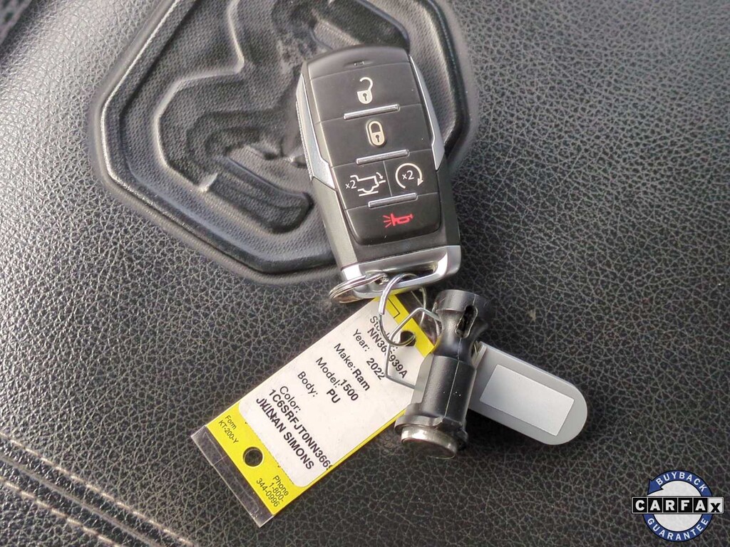 se habla Espanol! Owning our 2022 RAM 1500 Laramie Crew Cab 4X4 lets you lock and load with impressive luxury in Diamond Black Crystal Pearl! Motivated by a 5.7 Liter HEMI V8 serving up 395hp matched to an 8 Speed Automatic transmission for mighty strength. Heavy-duty shocks help this Four Wheel Drive truck handle bigger challenges backed by the ability to achieve nearly 22mpg on the highway. Thanks to our RAM 1500s LED lighting, fog lamps, heated chrome power mirrors, bright bumpers, and alloy wheels, you can also take on your days with dynamic good looks.