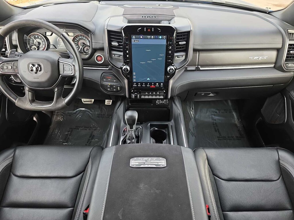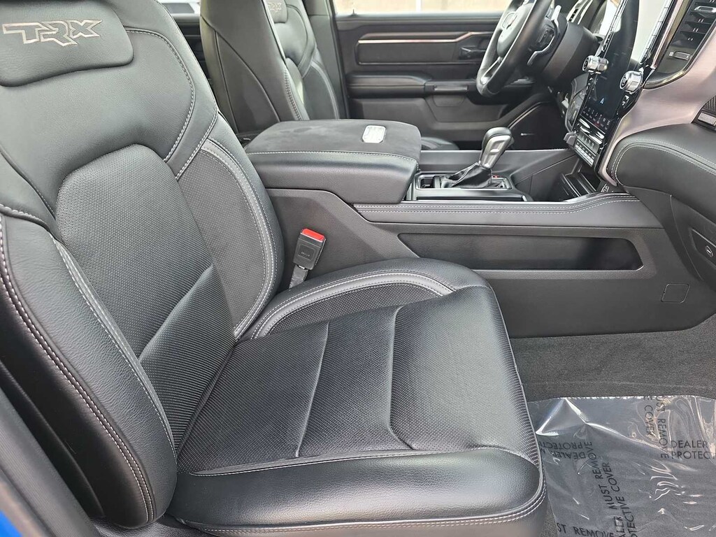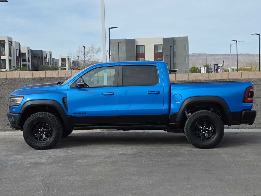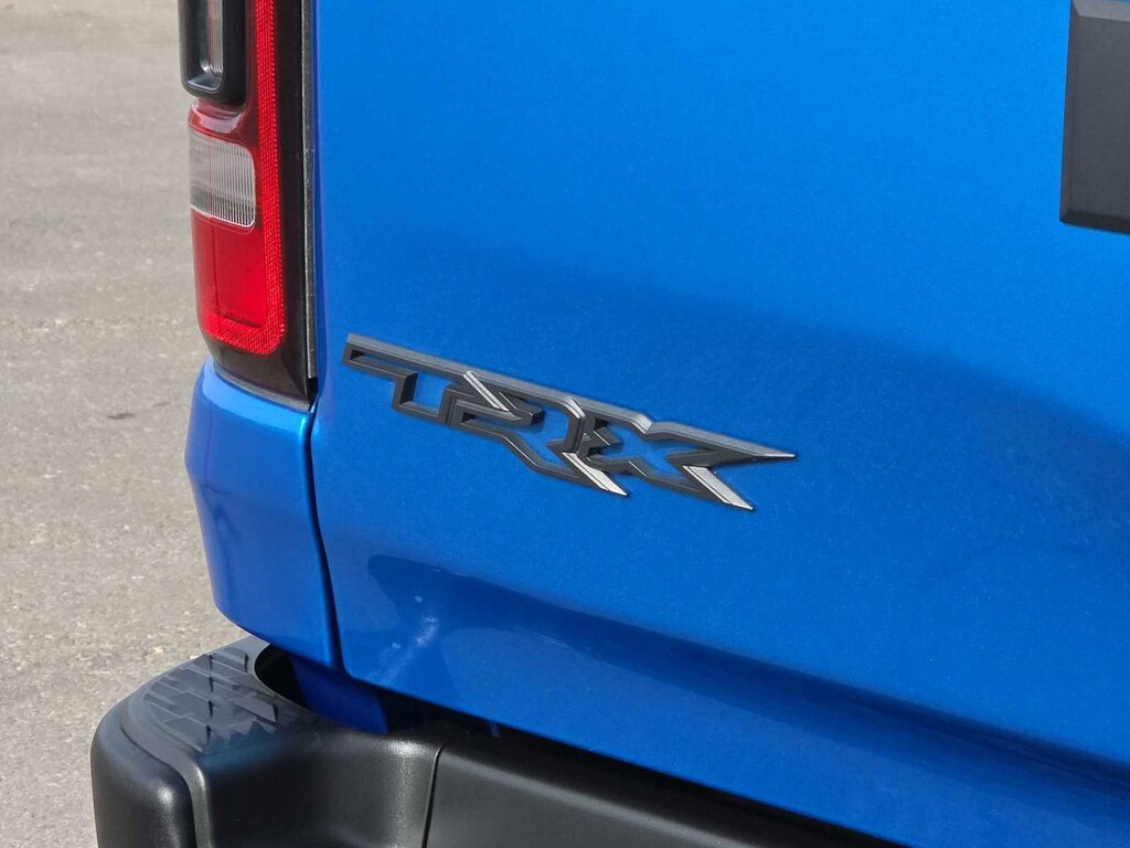 Our ferocious, Low Mileage 2022 RAM 1500 TRX Crew Cab 4X4 with the Level 2 Equipment Pack raises the bar on the road and off in Hydro Blue Pearl w/ Diamond Black Crystal Pearl Two Tone! Powered by a SuperCharged 6.2 Liter HEMI V8 generating 702hp for an 8 Speed Automatic transmission to race to 60mph in only 4.5 seconds. That muscle works with active-performance shocks, a raised ride height, and high-performance brakes so you can go faster on the trail, too, and this Four Wheel Drive truck returns nearly 14mpg on the highway. You can forget about blending in when you get behind the wheel since our RAM 1500 grabs attention with a menacing grille, massive fender flares, LED lighting, a sport performance hood, bold alloy wheels, TRX graphics, a panoramic sunroof, spray-on Bedliner, and our package for a power-release tailgate.