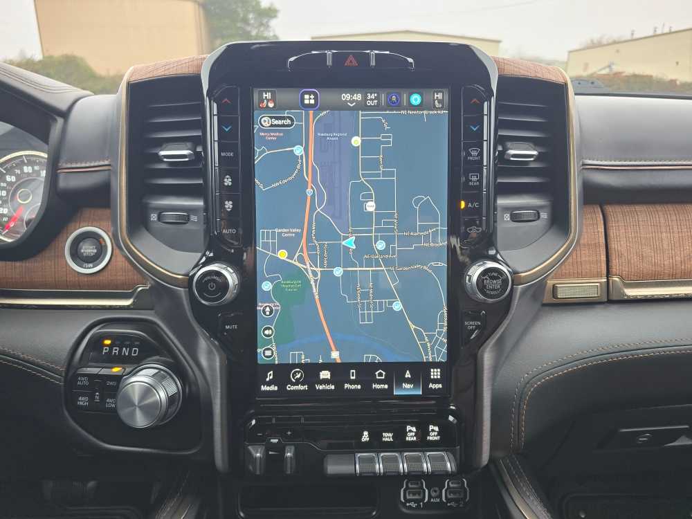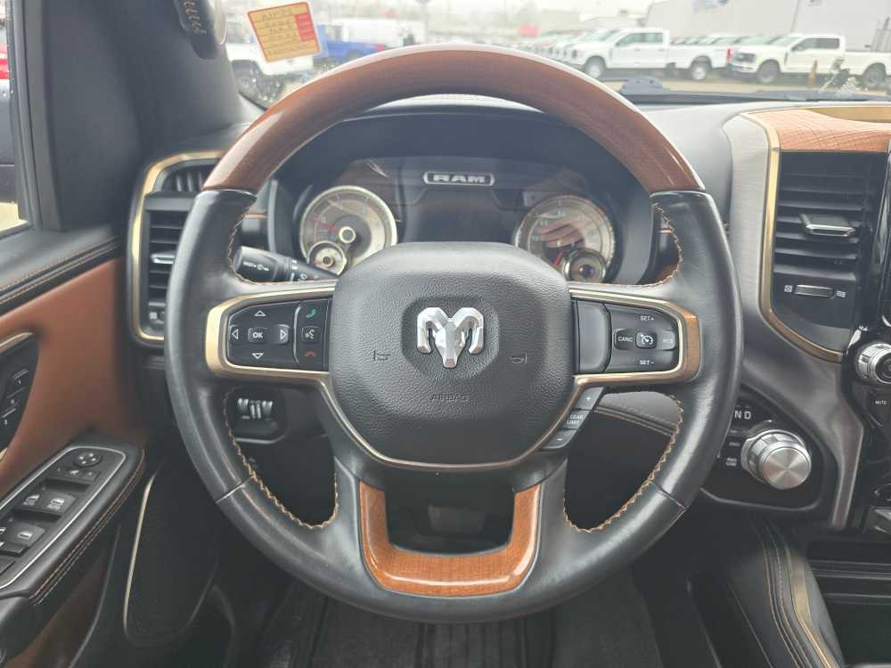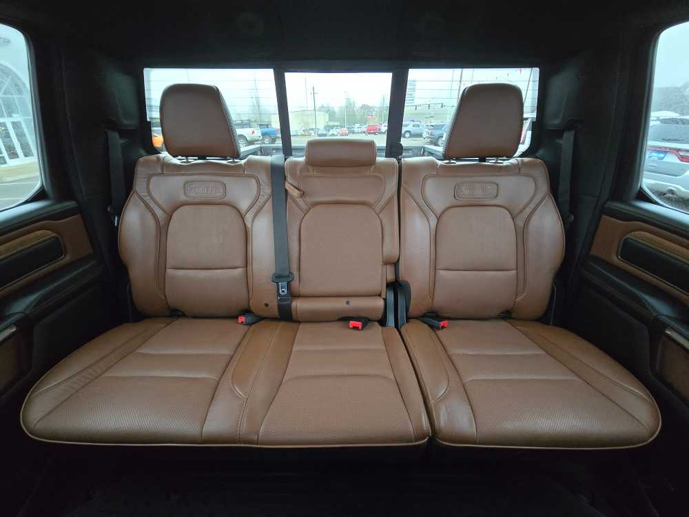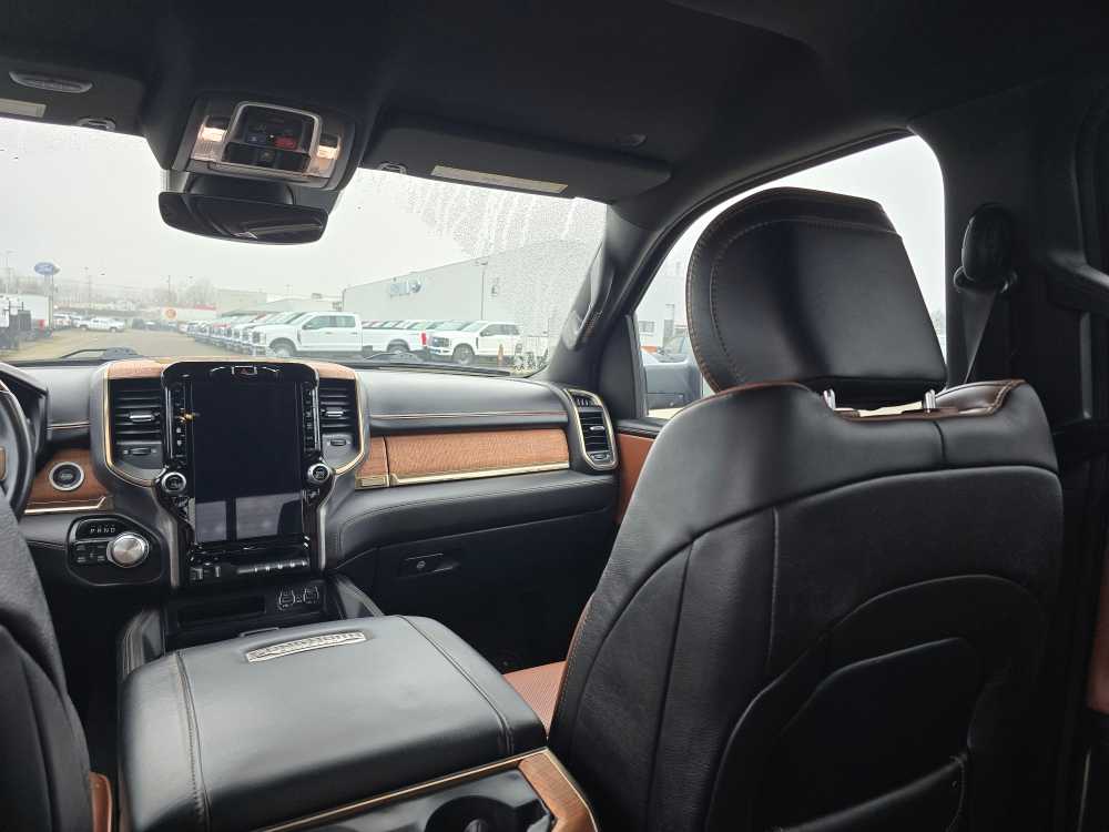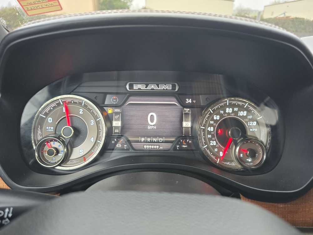 WHEELS: 22 X 9 POLISHED ALUMINUM W/INSERTS Tires: 285/45R22XL BSW All Season, Pirelli Brand Tires, ANTI-SPIN DIFFERENTIAL REAR AXLE, TRAILER BRAKE CONTROL, TRANSMISSION: 8-SPEED AUTOMATIC (DFV), ENGINE: 3.0L V6 TURBOCHARGED DIESEL Secondary Active Grille Shutters, 800-Amp Maintenance-Free Battery, EcoDiesel Badge, Heavy-Duty Engine Cooling, 250 Amp Alternator, GVWR: 3,265 kgs (7,200 lbs), Dual Rear Exhaust w/Bright Tips, Thermal Rear Axle, RADIO: UCONNECT 5W NAV W/12.0 DISPLAY 12 Touchscreen, All Radio-Equipped Vehicles, All R1 High Radios, CLASS IV RECEIVER HITCH. Ram Longhorn with Red Pearl exterior and New Saddle/Black interior features a V6 Cylinder Engine with 305 HP at 6400 RPM*. Non-Smoker vehicle