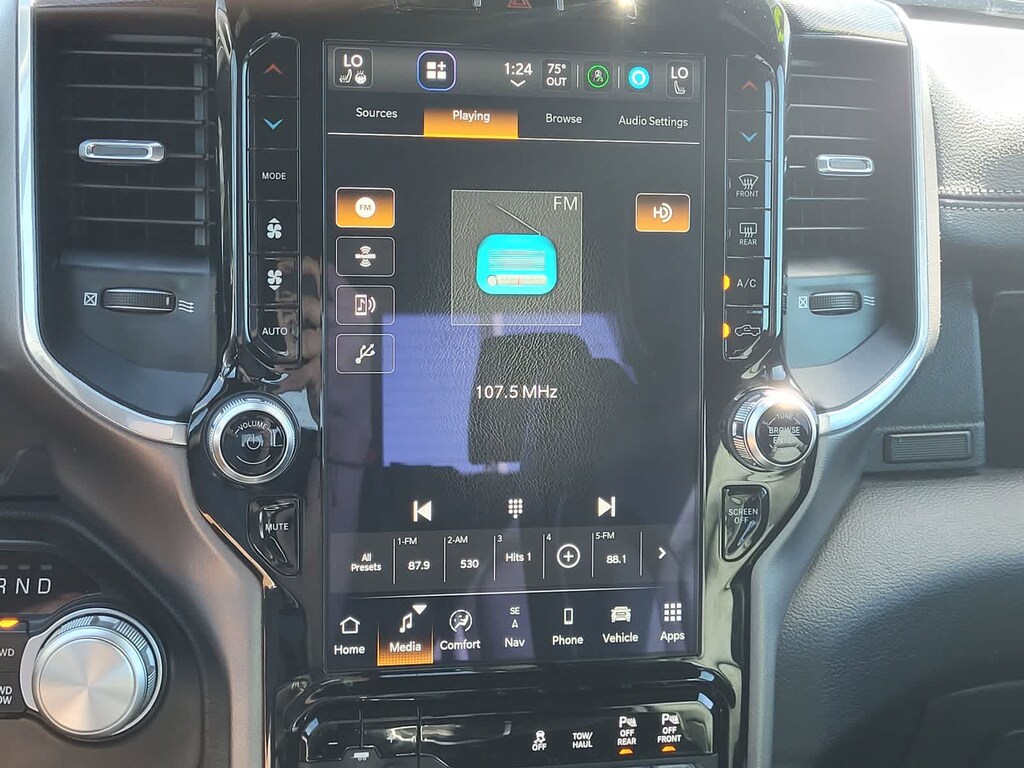 LARAMIE LEVEL 2 EQUIPMENT GROUP Remote Tailgate Release, harman/kardon® 19 Speaker Premium Sound, Rear Underseat Compartment Storage, Auto High Beam Headlamp Control, Blind Spot & Cross Path Detection, Rain Sensitive Windshield Wipers, Heated Second Row Seats, ParkSense Front/Rear Park Assist w/Stop, Foam Bottle Insert (Door Trim Panel), Rear 60/40 Folding Split Recline Seat, Radio: Uconnect 5 Nav w/8.4 Display, USB Host Flip, Disassociated Touchscreen Display, HD Radio, For More Info, Call 800-643-2112, Integrated Voice Command w/Bluetooth®, GPS Navigation, SiriusXM w/360L, All Radio Equipped Vehicles, Connected Travel & Traffic Services, All R1 High Radios, ENGINE: 5.7L V8 HEMI MDS VVT Active Noise Control System, Heavy Duty Engine Cooling, Passive Tuned Mass Damper, GVWR: 7,100 lbs, Dual Rear Exhaust w/Bright Tips, HEMI Badge, 220 Amp Alternator, SPORT APPEARANCE PACKAGE Tires: 275/55R20 OWL All Season, Body Color Premium Power Mirrors, Sport Performance Hood, Sport Decal, Body Color Door Handles, Wheels: 20 x 9 Premium Painted w/Inserts, Body Color Exterior Mirrors, Black Interior Accents, Body Color Front Bumper, Body Color Rear Bumper w/Step Pads, Grille Surround 3 Body Color Tex 2 Black, All Plant-Installed Decals, DUAL-PANE PANORAMIC SUNROOF LED Dome/Reading Lamp, Dome Dual LED Reading Lamp, BED UTILITY GROUP MOPAR Spray In Bedliner, MOPAR 4 Adjustable Cargo Tie-Down Hooks, Pick-Up Box Lighting, ANTI-SPIN DIFFERENTIAL REAR AXLE, TRANSMISSION: 8-SPEED AUTOMATIC (8HP75), BLACK, LEATHER TRIMMED BUCKET SEATS Bucket Seats, Full Length Upgraded Floor Console. Ram Laramie with Delmonico Red Pearlcoat exterior and Black interior features a 8 Cylinder Engine with 305 HP at 6400 RPM*.