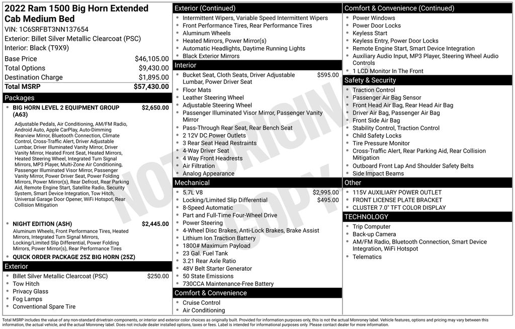 This Ram 1500 is more than just a workhorse; it's a sophisticated and well-equipped vehicle that will elevate your driving experience. The Big Horn Level 2 Equipment Group provides a host of advanced technology and convenience features, including an 8.4" touchscreen display, Android Auto, Apple CarPlay, and a premium audio system. The Night Edition package adds a touch of style with its distinctive black accents and 20" premium painted/polished wheels.