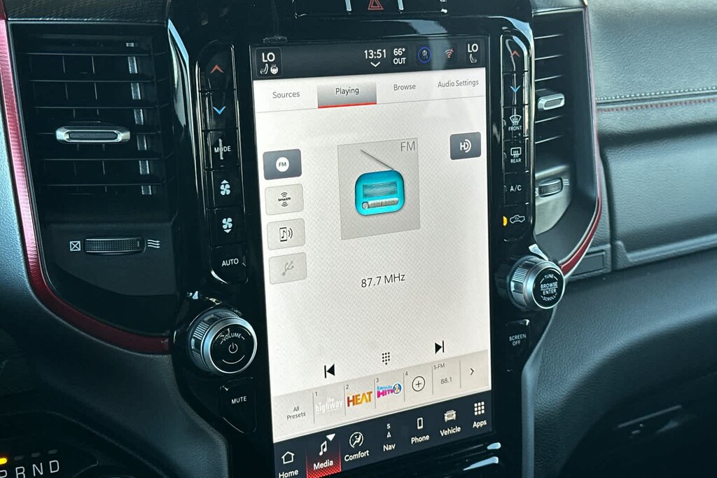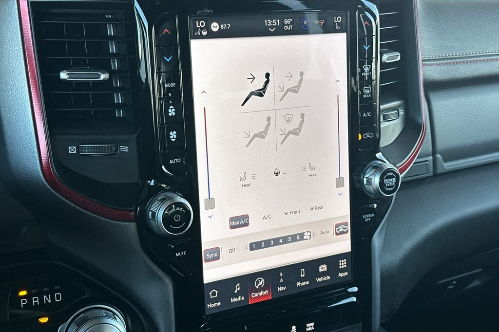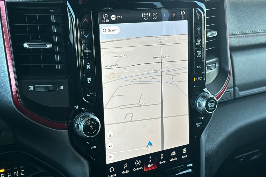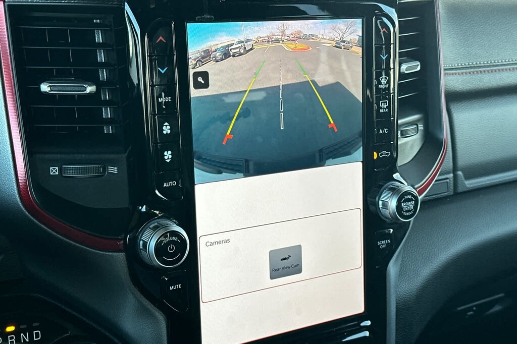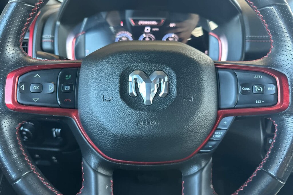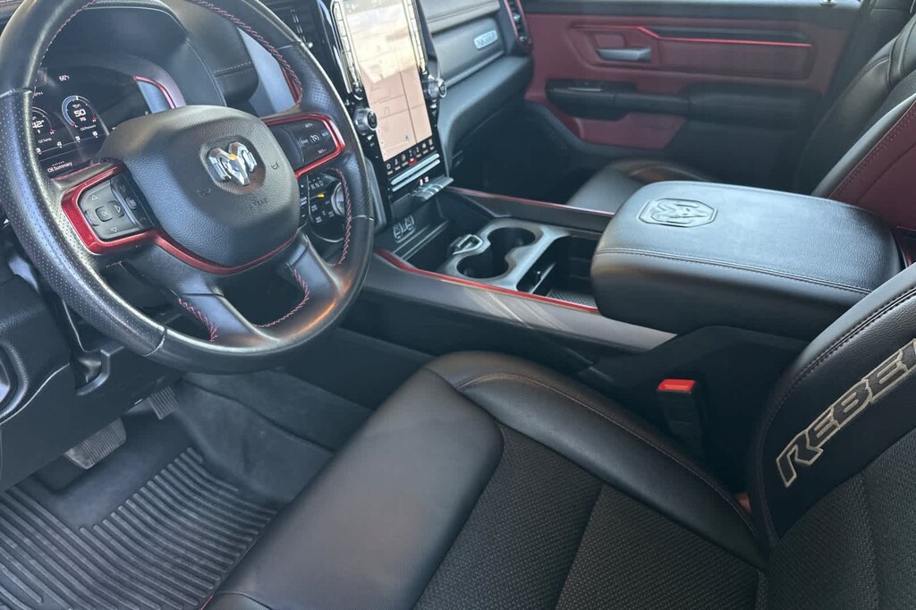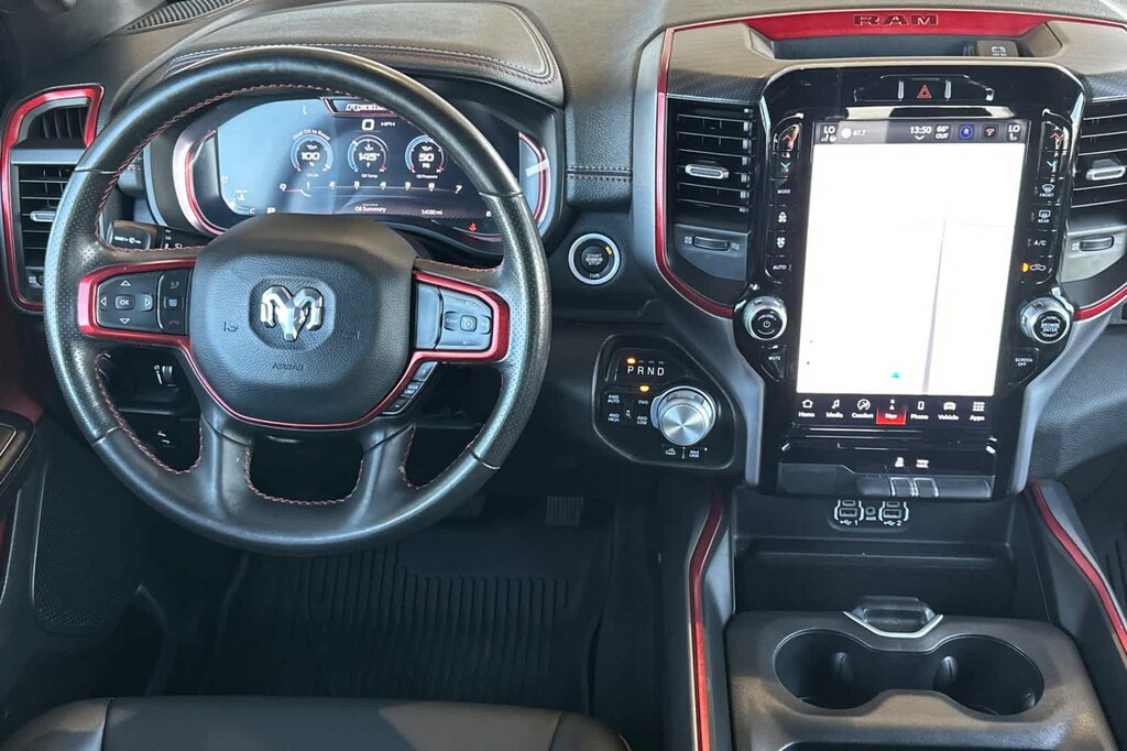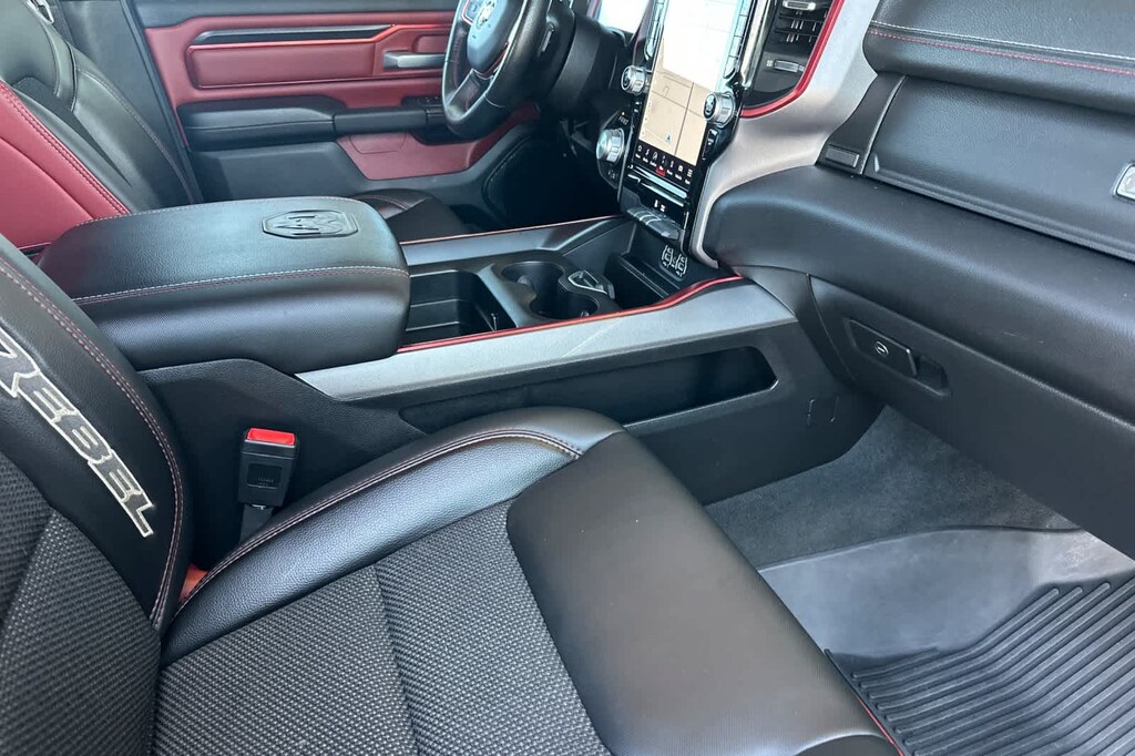 REBEL LEVEL 1 EQUIPMENT GROUP Radio: Uconnect 5W Nav w/12.0 Display, Rear Window Defroster, Power Adjustable Pedals, Rear Power Sliding Window, Rear Dome Lamp w/On/Off Switch, 12 Touchscreen, Power 8-Way Driver Seat, Front Heated Seats, Heated Steering Wheel, Door Trim Panel Foam Bottle Insert, 9 Alpine Speakers w/Subwoofer, Universal Garage Door Opener, 2nd Row In-Floor Storage Bins, Sun Visors w/Illuminated Vanity Mirrors, Power 2-Way Driver Lumbar Adjust, MOPAR SPRAY-IN BEDLINER, CLASS IV RECEIVER HITCH, TRANSMISSION: 8-SPEED AUTOMATIC (STD), ENGINE: 5.7L HEMI VVT V8 W/FUELSAVER MDS Active Noise Control System, Heavy-Duty Engine Cooling, Black Dual Exhaust Tips, HEMI Badge, 220 Amp Alternator (STD), BLACK MOPAR TUBULAR SIDE STEPS. 2023 Ram 1500 with Bright White exterior and Red/Black interior features a 8 Cylinder Engine with 305 HP at 6400 RPM*.