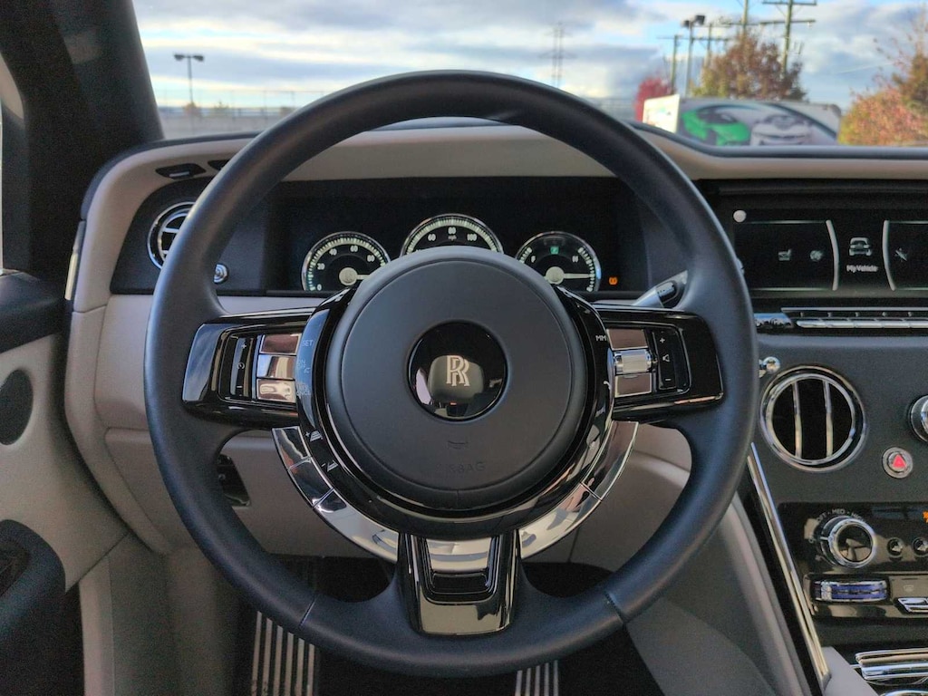 Bespoke Interior - Module Editing (Mixed Natural & Fullgrain Leather and Signature Key), Driver Assistance System (Active Cruise Control w/Stop & Go, Night Vision, and Park Assist), Extended Leather Headliner, Heads-Up Display, Navigation System, Open Pore Blackwood Veneer, Shooting Star Headliner, 16 Speakers, 2.81 Axle Ratio, 4-Wheel Disc Brakes, ABS brakes, Adaptive suspension, Air Conditioning, Alloy wheels, AM/FM radio: SiriusXM, Anti-whiplash front head restraints, Auto High-beam Headlights, Auto tilt-away steering wheel, Auto-dimming door mirrors, Auto-dimming Rear-View mirror, Auto-leveling suspension, Automatic temperature control, Bodyside moldings, Brake assist, Bumpers: body-color, CD player, Compass, Delay-off headlights, Door auto-latch, Driver door bin, Driver vanity mirror, Dual front impact airbags, Dual front side impact airbags, DVD-Audio, Electronic Stability Control, Emergency communication system: Rolls-Royce Assist, Exterior Parking Camera Rear, Four wheel independent suspension, Front anti-roll bar, Front Bucket Seats, Front Center Armrest w/Storage, Front dual zone A/C, Front reading lights, Garage door transmitter, Genuine wood console insert, Genuine wood door panel insert, Heated door mirrors, Heated Front Bucket Seats, Heated front seats, Heated rear seats, Heated steering wheel, Illuminated entry, Knee airbag, Leather Seat Trim, Leather steering wheel, Low tire pressure warning, Memory seat, Night vision lights, Occupant sensing airbag, Outside temperature display, Overhead airbag, Overhead console, Panic alarm, Passenger door bin, Passenger vanity mirror, Power adjustable rear head restraints, Power door mirrors, Power driver seat, Power moonroof, Power passenger seat, Power steering, Power windows, Radio data system, Radio: AM/FM/HD/Satellite, Rain sensing wipers, Rear air conditioning, Rear anti-roll bar, Rear dual zone A/C, Rear reading lights, Rear seat center armrest, Rear window defroster, Remote keyless entry, Security system, Speed control, Speed-sensing steering, Split folding rear seat, Spoiler, Steering wheel memory, Steering wheel mounted audio controls, Telescoping steering wheel, Tilt steering wheel, Traction control, Trip computer, Variably intermittent wipers, Weather band radio, and Wheels: 22 Silver Forged Aluminum.