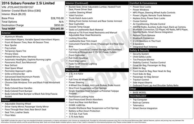 Crystal Black Silica 2016 Subaru Forester 2.5i Limited 4D Sport Utility AWD Lineartronic CVT 2.5L 4-Cylinder DOHC 16V VVT 24/32 City/Highway MPG