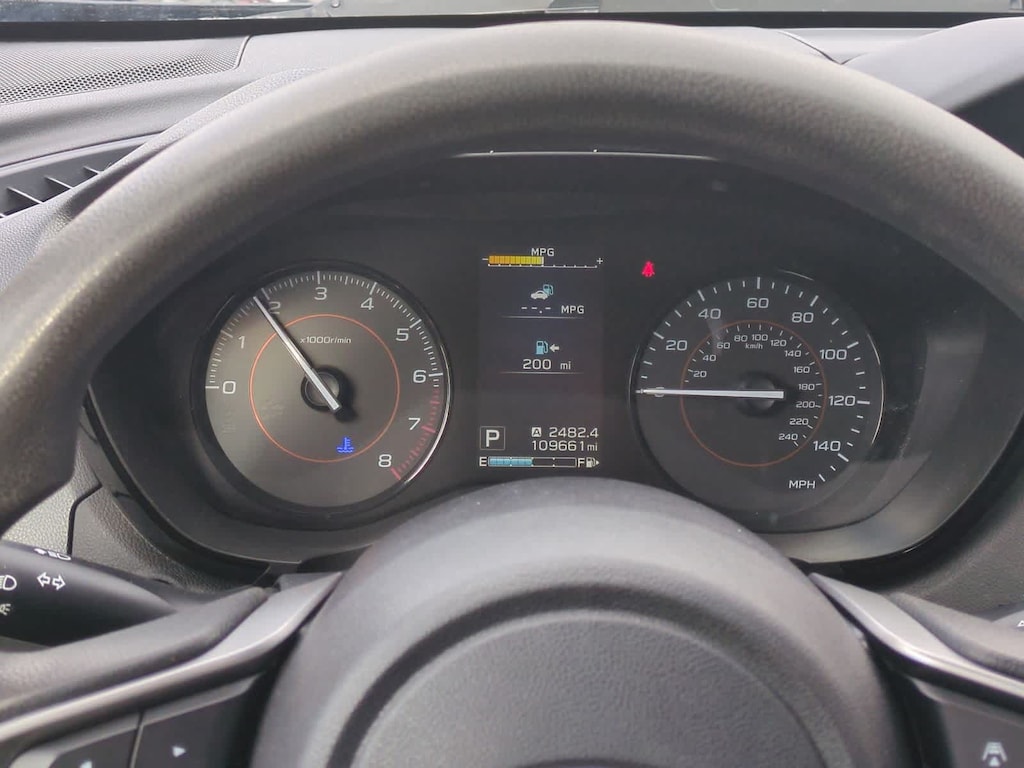 This 2.0i trim includes cloth upholstery, front bucket seats, split-folding rear seats, air conditioning, illuminated entry, front center armrest, high-grade instrument cluster with color display, overhead console, and a cargo-friendly interior equipped with cargo cover, cargo net, and cargo tray. Roof rails add versatility for outdoor gear, skis, and travel equipment.