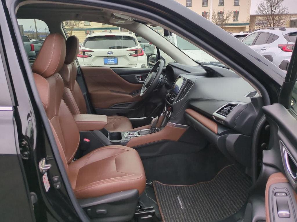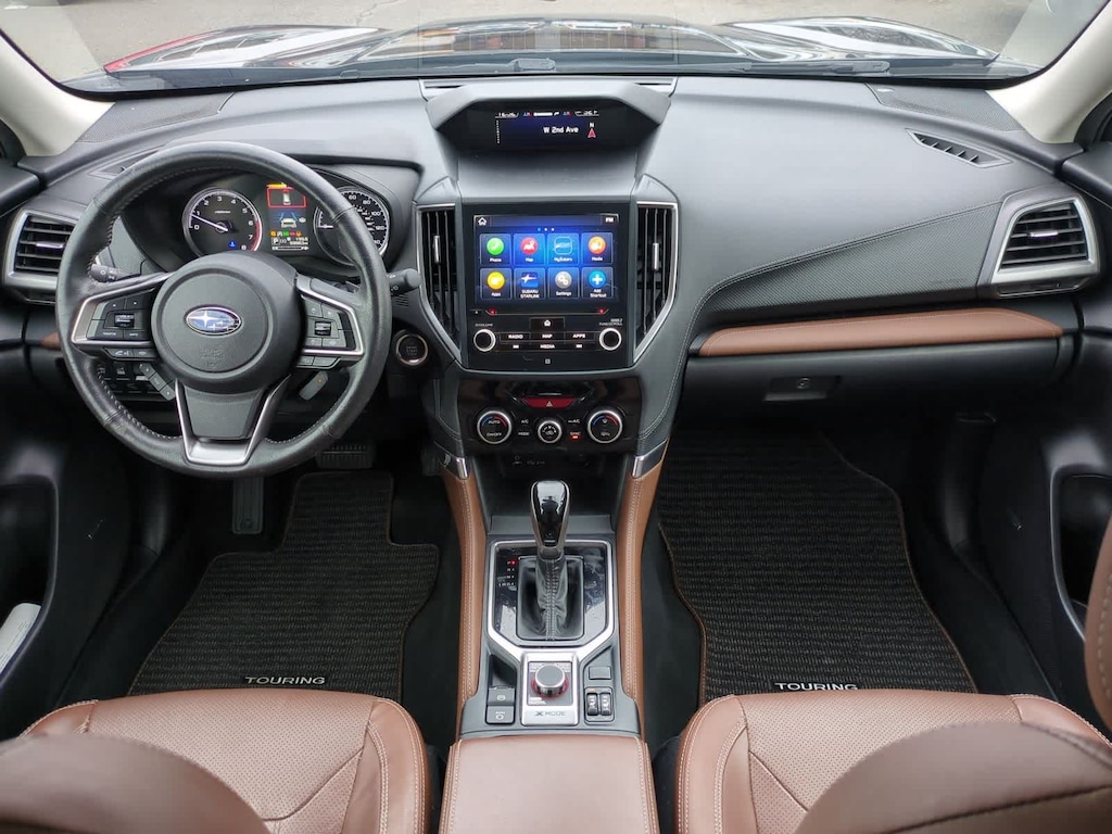 CARFAX One-Owner. Clean CARFAX. Crystal Black Silica 2020 Subaru Forester Touring AWD Lineartronic CVT 2.5L 4-Cylinder DOHC 16V VVT 3.70 Axle Ratio, 4-Wheel Disc Brakes, 9 Speakers, ABS brakes, Air Conditioning, All-Weather Floor Liners, Alloy wheels, AM/FM radio: SiriusXM, Auto High-beam Headlights, Auto-Dimming Exterior Mirror w/Approach Lighting, Auto-Dimming Mirror w/Compass & HomeLink, Automatic temperature control, Brake assist, Bumpers: body-color, Cargo Net, CD player, Driver door bin, Driver vanity mirror, Dual front impact airbags, Dual front side impact airbags, Electronic Stability Control, Emergency communication system: STARLINK Safety and Security (Subscription Required), Exterior Parking Camera Rear, Four wheel independent suspension, Front anti-roll bar, Front Bucket Seats, Front Center Armrest, Front dual zone A/C, Front fog lights, Front reading lights, Fully automatic headlights, harman kardon 576W Amp & Speaker System, harman/kardonî Speakers, Heated door mirrors, Heated Front Bucket Seats, Heated front seats, Heated rear seats, Heated steering wheel, HVAC memory, Illuminated entry, Knee airbag, Leather Shift Knob, Low tire pressure warning, Memory seat, Navigation System, Occupant sensing airbag, Outside temperature display, Overhead airbag, Overhead console, Paddle-Shift Control Switches, Panic alarm, Passenger door bin, Passenger vanity mirror, Perforated Leather-Trimmed Upholstery, Popular Package #2, Power door mirrors, Power driver seat, Power Liftgate, Power moonroof: Panoramic, Power passenger seat, Power steering, Power windows, Premium audio system: harman/kardon, Radio data system, Radio: Subaru Starlink 8.0 Multimedia Nav System, Rear anti-roll bar, Rear Bumper Cover, Rear seat center armrest, Rear Seatback Protector, Rear window defroster, Rear window wiper, Remote keyless entry, Roof rack: rails only, Security system, Speed control, Speed-sensing steering, Splash Guards, Split folding rear seat, Spoiler, STARLINK/Apple CarPlay/Android Auto, Steering wheel mounted audio controls, Tachometer, Telescoping steering wheel, Tilt steering wheel, Traction control, Trip computer, Turn signal indicator mirrors, Variably intermittent wipers, Wheels: 18 x 7.0J Blk Machine Touring Alum Alloy.