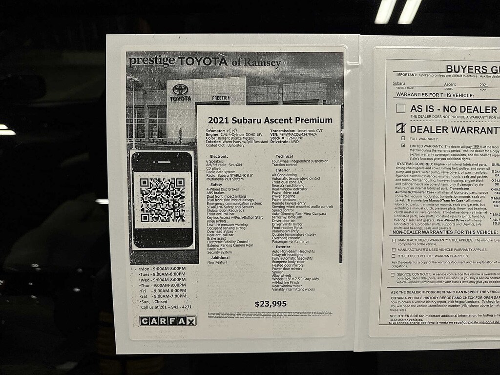 This 2021 Subaru Ascent Premium will not make it to the weekend!! CALL NOW to reserve your test drive!! (844) 838-7075 Please Visit www.PrestigeToyota.com for further details. Price does not include licensing costs, registration fees, taxes and dealer doc fee of $999 which are to be paid by the consumer.