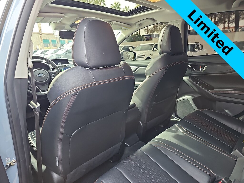 THIS VEHICLE IS EQUIPPED WITH THE FOLLOWING OPTIONS AND FEATURES: Moonroof Package 1 (Power Moonroof), 3.70 Axle Ratio, 4-Wheel Disc Brakes, 6 Speakers, ABS brakes, Air Conditioning, All-Weather Floor Liners, Alloy wheels, AM/FM radio: SiriusXM, Anti-whiplash front head restraints, Auto High-beam Headlights, Auto-Dimming Exterior Mirror w/Approach Light, Auto-Dimming Mirror w/Compass & HomeLink, Automatic temperature control, Brake assist, Bumpers: body-color, Cargo Net, CD player, Driver door bin, Driver vanity mirror, Dual front impact airbags, Dual front side impact airbags, Electronic Stability Control, Emergency communication system: STARLINK Safety and Security (Subscription Required), Exterior Parking Camera Rear, Four wheel independent suspension, Front anti-roll bar, Front Bucket Seats, Front Center Armrest, Front fog lights, Front reading lights, Fully automatic headlights, Heated door mirrors, Heated Front Bucket Seats, Heated front seats, Illuminated entry, Knee airbag, Leather-Trimmed Upholstery, Low tire pressure warning, Occupant sensing airbag, Outside temperature display, Overhead airbag, Overhead console, Panic alarm, Passenger door bin, Passenger vanity mirror, Power door mirrors, Power driver seat, Power steering, Power windows, Radio data system, Radio: Subaru STARLINK 8.0 Multimedia Plus System, Rear anti-roll bar, Rear seat center armrest, Rear Seatback Protector, Rear window defroster, Rear window wiper, Remote keyless entry, Security system, Speed control, Speed-sensing steering, Split folding rear seat, Spoiler, STARLINK/Apple CarPlay/Android Auto, Steering wheel mounted audio controls, Subaru STARLINK Smartphone Integration, Tachometer, Telescoping steering wheel, Tilt steering wheel, Traction control, Trip computer, Turn signal indicator mirrors, Variably intermittent wipers, and Wheels: 18 Alloy Machine Finish. 27/34 City/Highway MPG