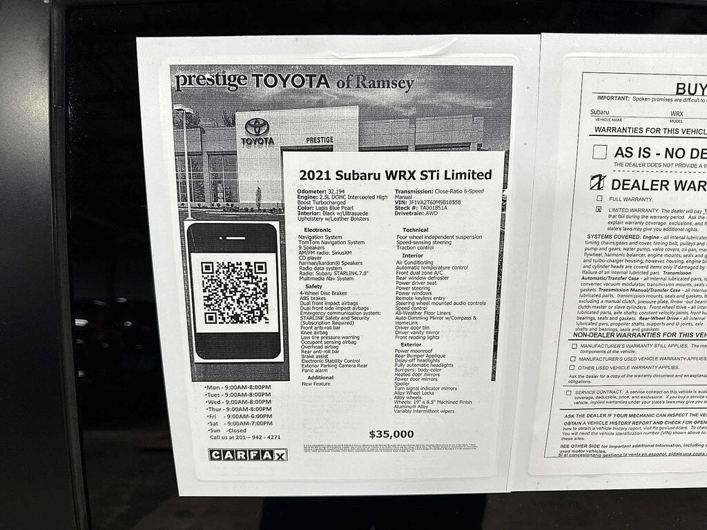 This 2021 Subaru WRX STi Limited will not make it to the weekend!! CALL NOW to reserve your test drive!! (844) 838-7075 Please Visit www.PrestigeToyota.com for further details. Price does not include licensing costs, registration fees, taxes and dealer doc fee of $999 which are to be paid by the consumer.
