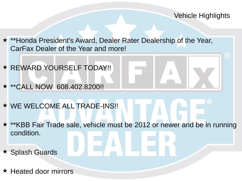 **Happy New Year!! Make your New Years Resolution to Spoil yourself with a New Car!!! To Celebrate were running $1000 over KBB Trade-in!! Stop in for your New or Used Honda, or anything in between and see why were Dealerrater Dealer of the Year! Honda Presidents Award Dealer, and Carfax Dealer of the year, come see for yourself why were rated one of Madisons Best and rated a 4.8/5 on 5000 reviews on Cars.com!!! Also Have Corporate discounts available, see a sales associate for details.