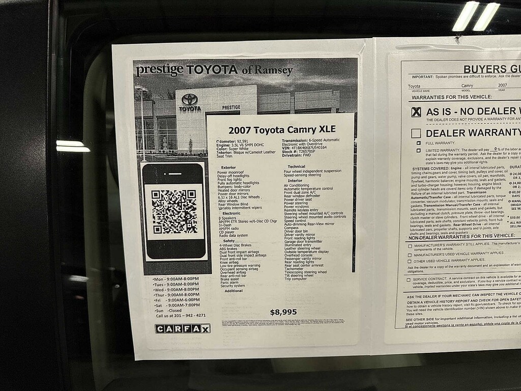 4D Sedan, 3.5L V6 SMPI DOHC, 6-Speed Automatic Electronic with Overdrive, FWD, Super White, Bisque w/Camelot Leather Seat Trim, ABS brakes, Alloy wheels, Camelot Leather Seat Trim, Compass, Front dual zone A/C, Heated door mirrors, Illuminated entry, Low tire pressure warning, Power moonroof, Remote keyless entry. CARFAX One-Owner. Super White 2007 Toyota Camry XLE FWD 6-Speed Automatic Electronic with Overdrive 3.5L V6 SMPI DOHC