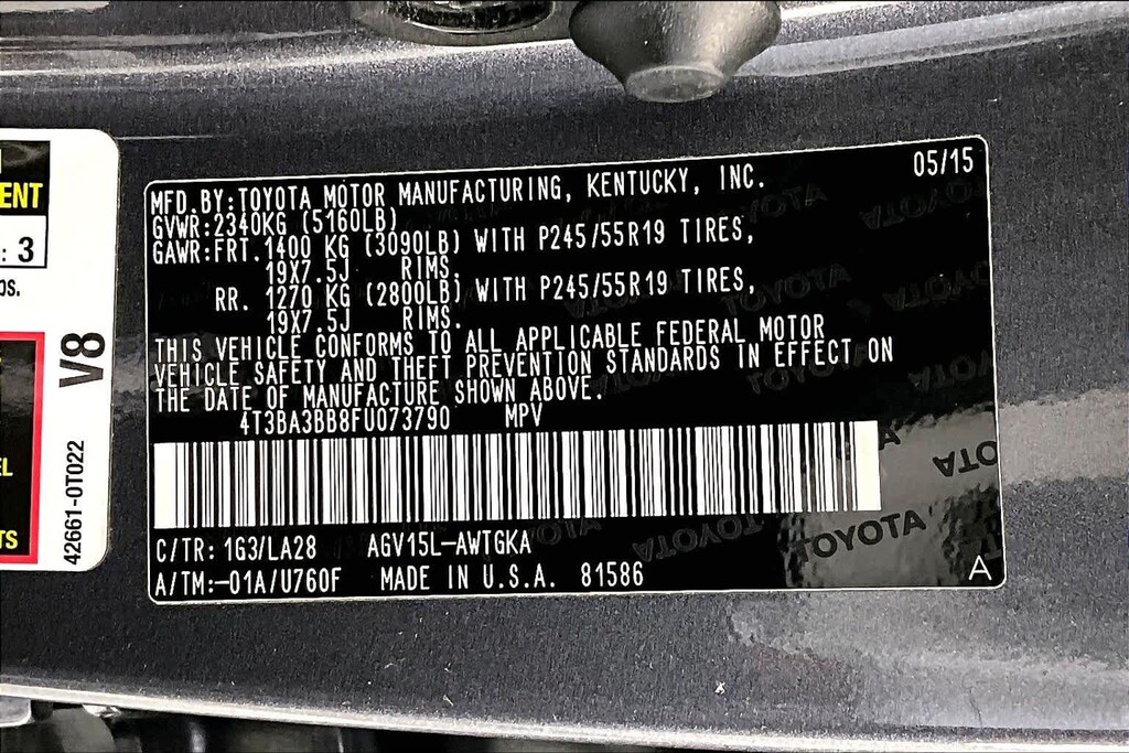 Leather & Memory Package, Protection Package (Carpet Floor Mats & Carpet Cargo Mat, Door Edge Guards, and Mudguards), Smart Key Package, XLE Package (Anti-Theft System, Driver & Passenger Seat Heater, Power Folding Outside Rear-View Mirrors, and Power Lift-Gate w/Jam Protection), ABS brakes, Air Conditioning, Alloy wheels, Automatic temperature control, Compass, Electronic Stability Control, Front dual zone A/C, Heated door mirrors, Heated Front Bucket Seats, Heated front seats, Illuminated entry, Leather Seat Trim, Low tire pressure warning, Power Liftgate, Rear window defroster, Remote keyless entry, Traction control, 19 x 7.5J Aluminum Alloy Wheels, 4-Wheel Disc Brakes, 4.356 Axle Ratio, 6 Speakers, AM/FM radio: SiriusXM, Anti-whiplash front head restraints, Auto-dimming Rear-View mirror, Brake assist, Bumpers: body-color, CD player, Delay-off headlights, Driver door bin, Driver vanity mirror, Dual front impact airbags, Dual front side impact airbags, Exterior Parking Camera Rear, Four wheel independent suspension, Front anti-roll bar, Front Bucket Seats, Front Center Armrest, Front fog lights, Front reading lights, Fully automatic headlights, Garage door transmitter: HomeLink, Knee airbag, Memory seat, Occupant sensing airbag, Outside temperature display, Overhead airbag, Overhead console, Panic alarm, Passenger door bin, Passenger vanity mirror, Power door mirrors, Power driver seat, Power passenger seat, Power steering, Power windows, Radio: Entune Premium Audio w/Nav & App Suite, Rear anti-roll bar, Rear reading lights, Rear seat center armrest, Rear window wiper, Security system, Speed control, Speed-sensing steering, Split folding rear seat, Spoiler, Steering wheel mounted audio controls, Tachometer, Telescoping steering wheel, Tilt steering wheel, Trip computer, Turn signal indicator mirrors, and Variably intermittent wipers. Local Trade, ABS brakes, Air Conditioning, Alloy wheels, Anti-Theft System, Automatic temperature control, Carpet Floor Mats & Carpet Cargo Mat, Compass, Door Edge Guards, Driver & Passenger Seat Heater, Electronic Stability Control, Front dual zone A/C, Heated door mirrors, Heated Front Bucket Seats, Heated front seats, Illuminated entry, Leather & Memory Package, Leather Seat Trim, Low tire pressure warning, Mudguards, Power Folding Outside Rear-View Mirrors, Power Lift-Gate w/Jam Protection, Power Liftgate, Protection Package, Rear window defroster, Remote keyless entry, Smart Key Package, Traction control, XLE Package.
