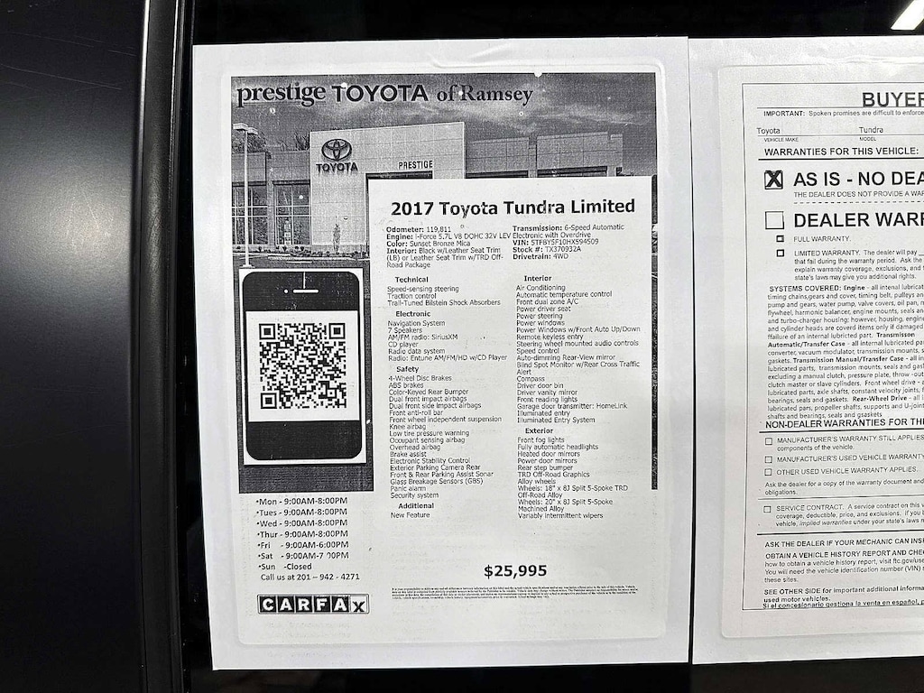This 2017 Toyota Tundra Limited will not make it to the weekend!! CALL NOW to reserve your test drive!! (844) 838-7075 Please Visit www.PrestigeToyota.com for further details. Price does not include licensing costs, registration fees, taxes and dealer doc fee of $999 which are to be paid by the consumer.