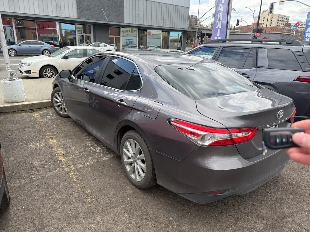 Predawn Gray Mica 2018 Toyota Camry L FWD 8-Speed Automatic 2.5L I4 DOHC 16V Black Cloth, 4-Wheel Disc Brakes, 6 Speakers, 6.5J x 16 Steel Wheels, ABS brakes, Air Conditioning, AM/FM radio, Auto High-beam Headlights, Brake assist, Bumpers: body-color, Delay-off headlights, Driver door bin, Driver vanity mirror, Dual front impact airbags, Dual front side impact airbags, Electronic Stability Control, Exterior Parking Camera Rear, Fabric Seat Trim, Four wheel independent suspension, Front anti-roll bar, Front Bucket Seats, Front Center Armrest, Front reading lights, Fully automatic headlights, Illuminated entry, Knee airbag, Low tire pressure warning, Occupant sensing airbag, Outside temperature display, Overhead airbag, Overhead console, Panic alarm, Passenger door bin, Passenger vanity mirror, Power door mirrors, Power steering, Power windows, Radio data system, Radio: Entune 3.0 Audio, Rear anti-roll bar, Rear reading lights, Rear side impact airbag, Rear window defroster, Remote keyless entry, Speed control, Speed-sensing steering, Steering wheel mounted audio controls, Tachometer, Telescoping steering wheel, Tilt steering wheel, Traction control, Trip computer, Variably intermittent wipers, Black Cloth.