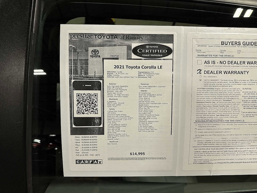 This 2021 Toyota Corolla LE will not make it to the weekend!! CALL NOW to reserve your test drive!! (844) 838-7075 Please Visit www.PrestigeToyota.com for further details. Price does not include licensing costs, registration fees, taxes and dealer doc fee of $999 which are to be paid by the consumer.