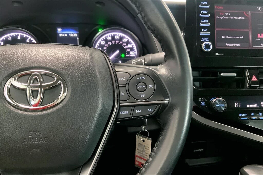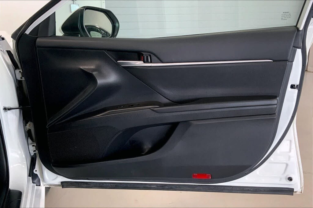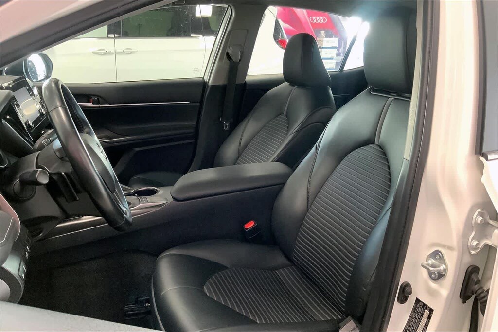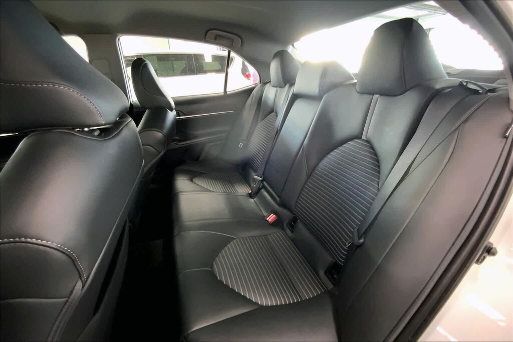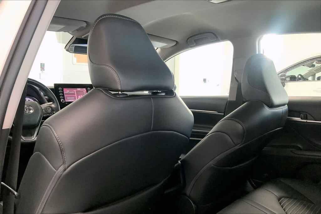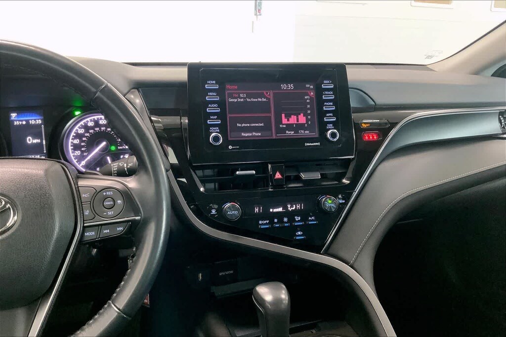 Camry is nicely equipped with Black w/Perforated Leather Seat Trim, 4-Wheel Disc Brakes, 6 Speakers, ABS brakes, Air Conditioning, Alloy wheels, AM/FM radio: SiriusXM, Apple CarPlay/Android Auto, Auto High-beam Headlights, Automatic temperature control, Brake assist, Bumpers: body-color, Delay-off headlights, Driver door bin, Driver vanity mirror, Dual front impact airbags, Dual front side impact airbags, Electronic Stability Control, Emergency communication system: Safety Connect (1-year trial), Exterior Parking Camera Rear, Four wheel independent suspension, Front anti-roll bar, Front Bucket Seats, Front Center Armrest, Front dual zone A/C, Front reading lights, Fully automatic headlights, Heated door mirrors, Illuminated entry, Knee airbag, Leather steering wheel, Low tire pressure warning, Occupant sensing airbag, Outside temperature display, Overhead airbag, Overhead console, Panic alarm, Passenger door bin, Passenger vanity mirror, Power door mirrors, Power driver seat, Power steering, Power windows, Radio data system, Radio: Audio, Rear anti-roll bar, Rear seat center armrest, Rear side impact airbag, Rear window defroster, Remote keyless entry, Security system, Speed control, Speed-sensing steering, Split folding rear seat, Spoiler, Sport SofTex Seat Trim w/Fabric Inserts, Steering wheel mounted audio controls, Tachometer, Telescoping steering wheel, Tilt steering wheel, Traction control, Trip computer, Turn signal indicator mirrors, and Variably intermittent wipers.
