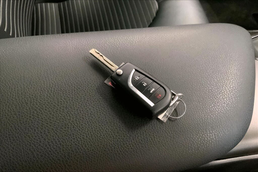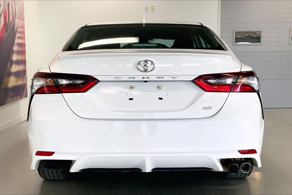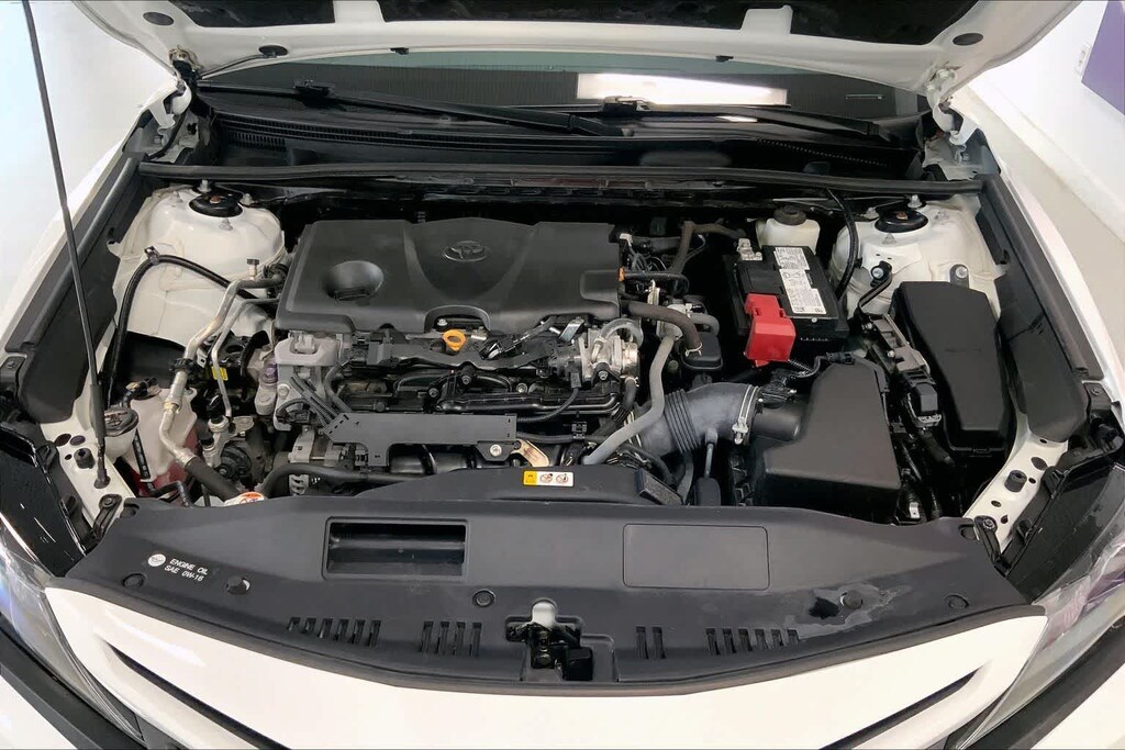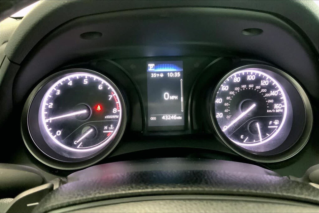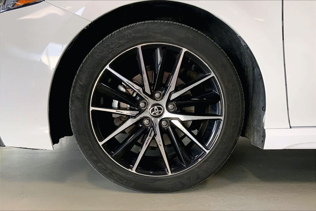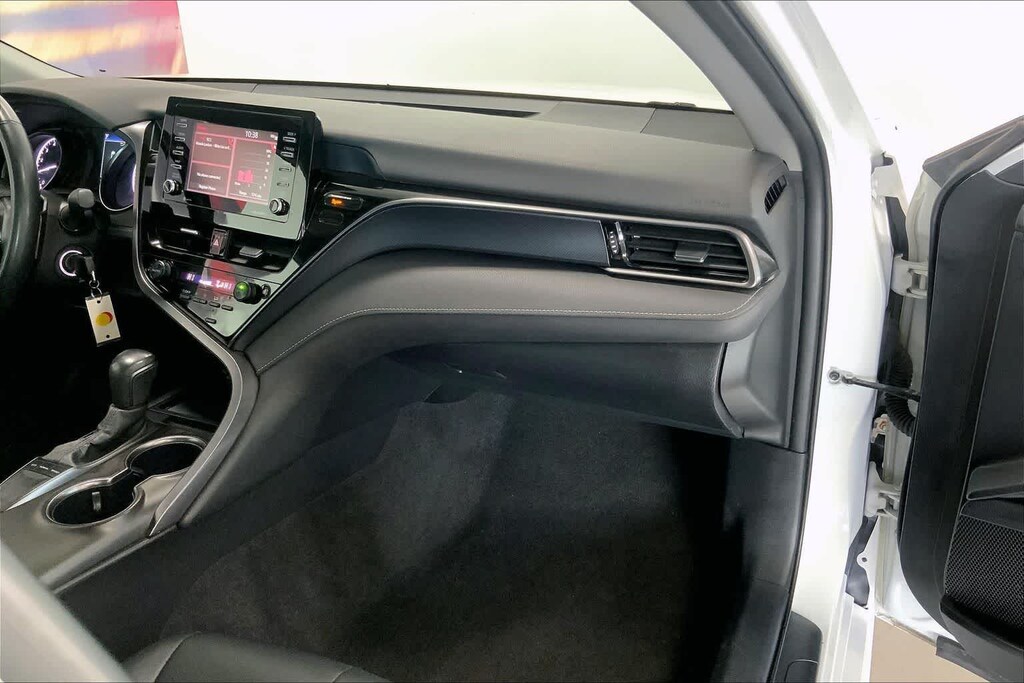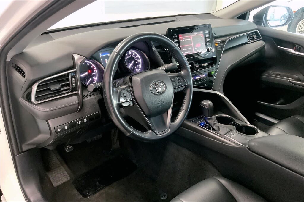 Camry is nicely equipped with Black w/Perforated Leather Seat Trim, 4-Wheel Disc Brakes, 6 Speakers, ABS brakes, Air Conditioning, Alloy wheels, AM/FM radio: SiriusXM, Apple CarPlay/Android Auto, Auto High-beam Headlights, Automatic temperature control, Brake assist, Bumpers: body-color, Delay-off headlights, Driver door bin, Driver vanity mirror, Dual front impact airbags, Dual front side impact airbags, Electronic Stability Control, Emergency communication system: Safety Connect (1-year trial), Exterior Parking Camera Rear, Four wheel independent suspension, Front anti-roll bar, Front Bucket Seats, Front Center Armrest, Front dual zone A/C, Front reading lights, Fully automatic headlights, Heated door mirrors, Illuminated entry, Knee airbag, Leather steering wheel, Low tire pressure warning, Occupant sensing airbag, Outside temperature display, Overhead airbag, Overhead console, Panic alarm, Passenger door bin, Passenger vanity mirror, Power door mirrors, Power driver seat, Power steering, Power windows, Radio data system, Radio: Audio, Rear anti-roll bar, Rear seat center armrest, Rear side impact airbag, Rear window defroster, Remote keyless entry, Security system, Speed control, Speed-sensing steering, Split folding rear seat, Spoiler, Sport SofTex Seat Trim w/Fabric Inserts, Steering wheel mounted audio controls, Tachometer, Telescoping steering wheel, Tilt steering wheel, Traction control, Trip computer, Turn signal indicator mirrors, and Variably intermittent wipers.